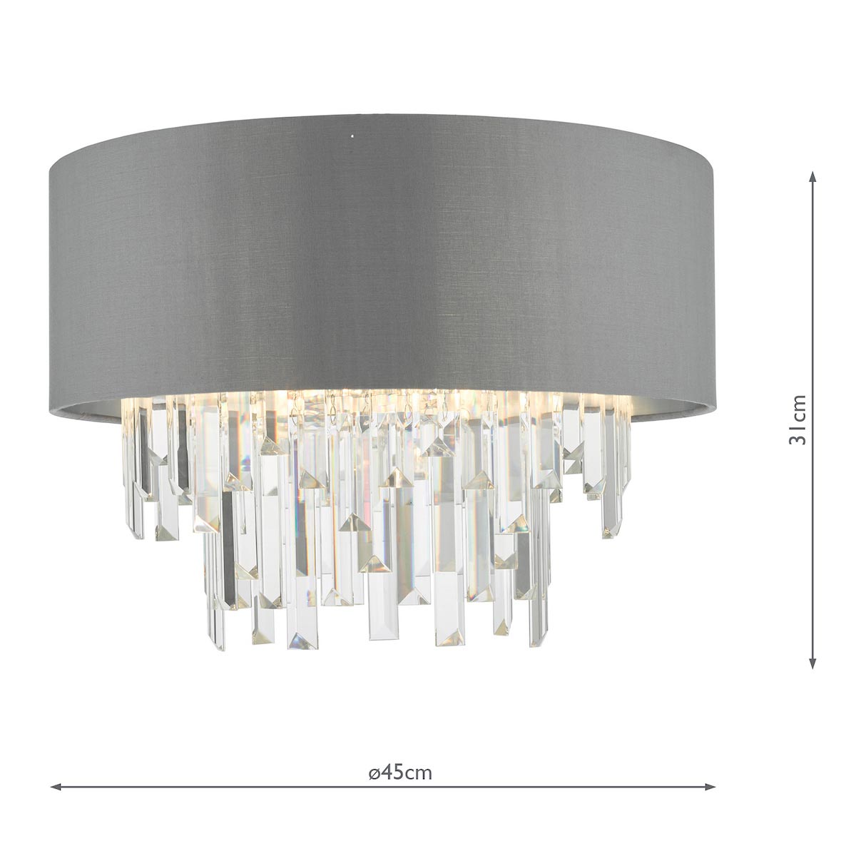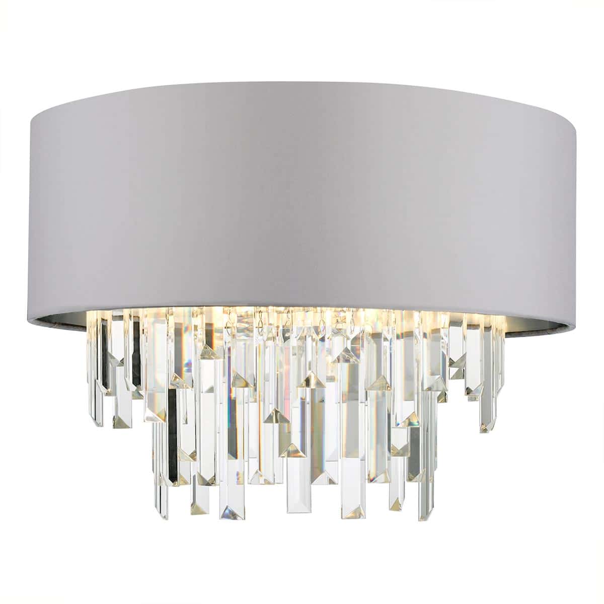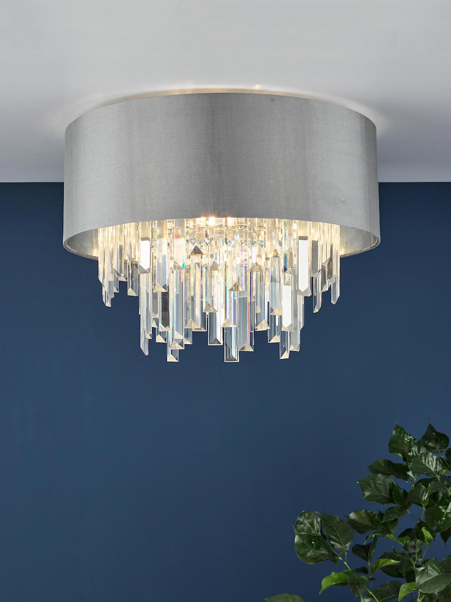 Featuring two tiers of crystal and a grey satin drum shade with silver lining that adds a clean simplicity to the overall ceiling light, making it perfect for a bedroom or sitting room.