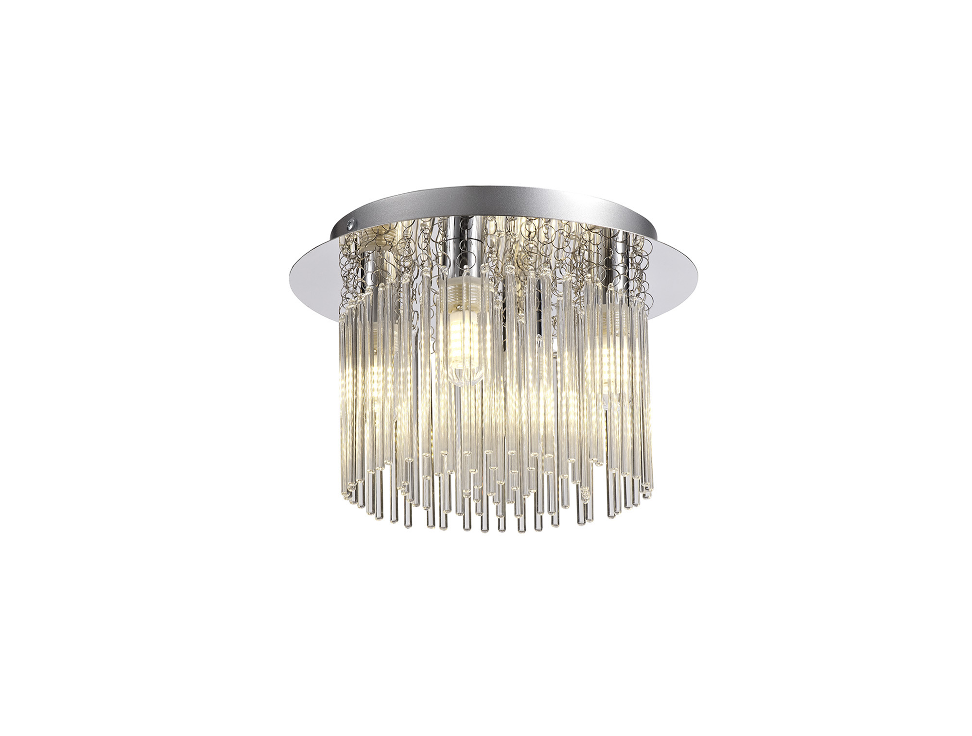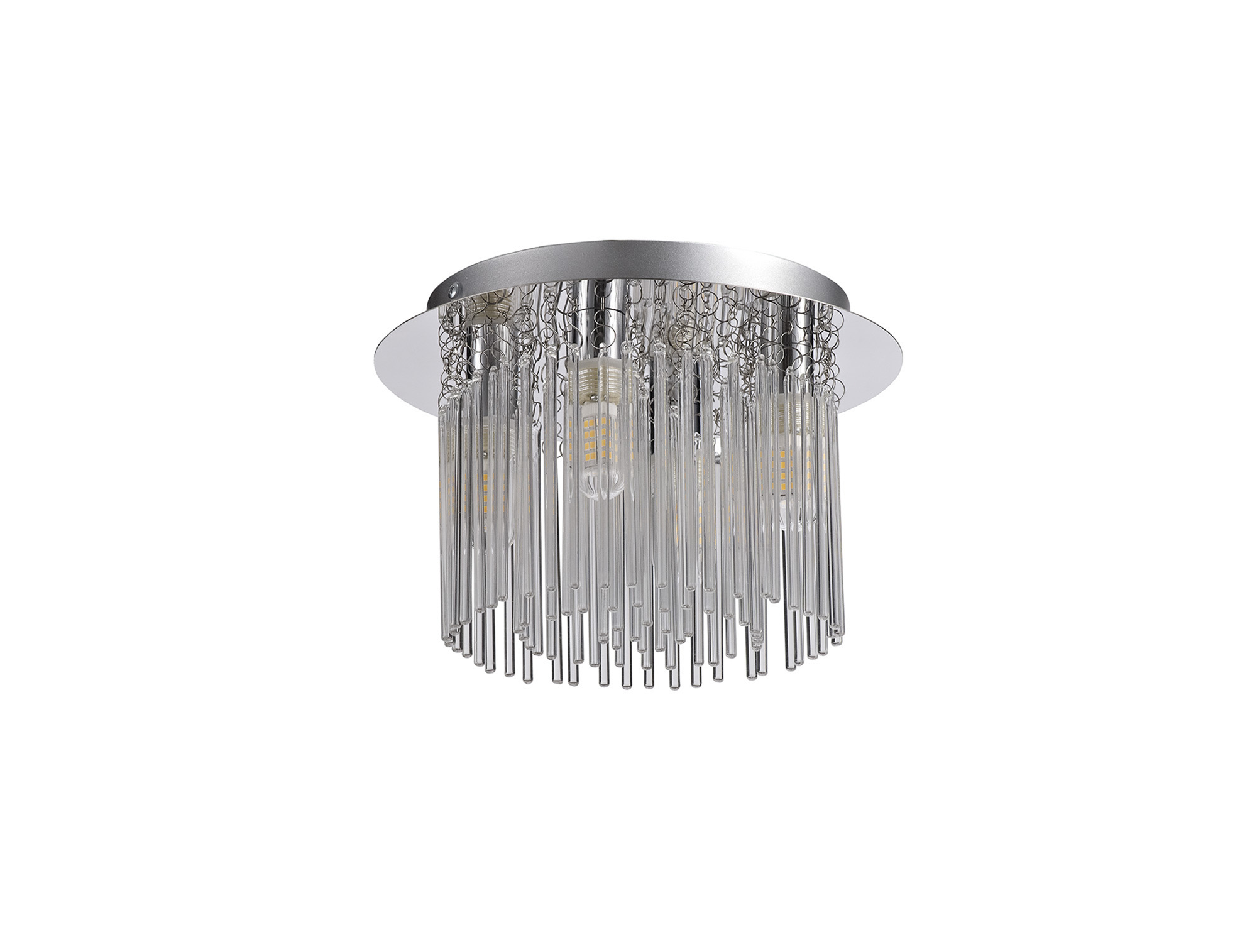 The Aeril flush ceiling lights are available in either a 4 or 6 light version. The round polished chrome plates offer a simplistic neutral setting to hang the generous number of clear glass rods which are positioned in a circular format of rows across the frame.