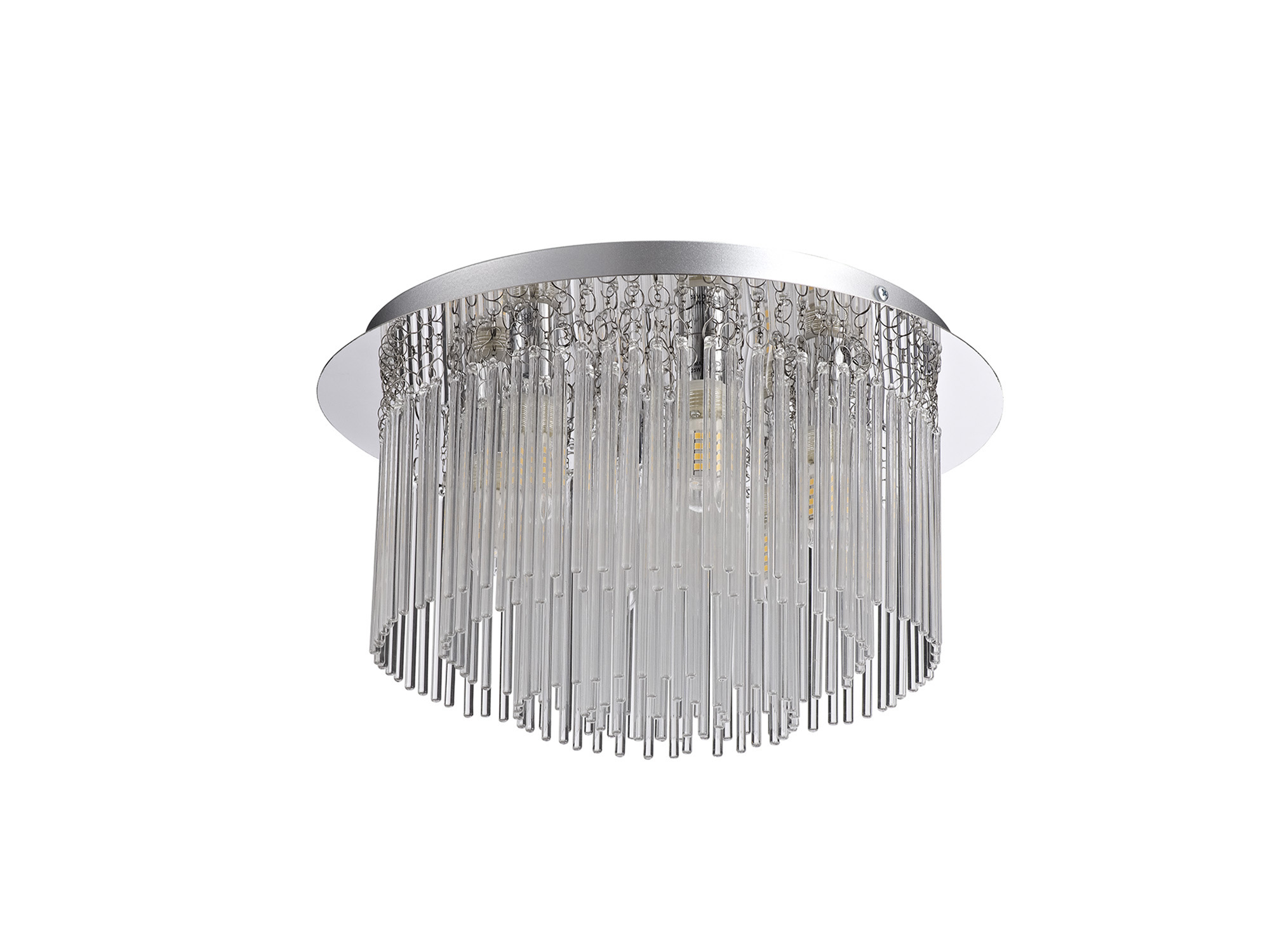 The Aeril flush ceiling lights are available in either a 4 or 6 light version. The round polished chrome plates offer a simplistic neutral setting to hang the generous number of clear glass rods which are positioned in a circular format of rows across the frame.
