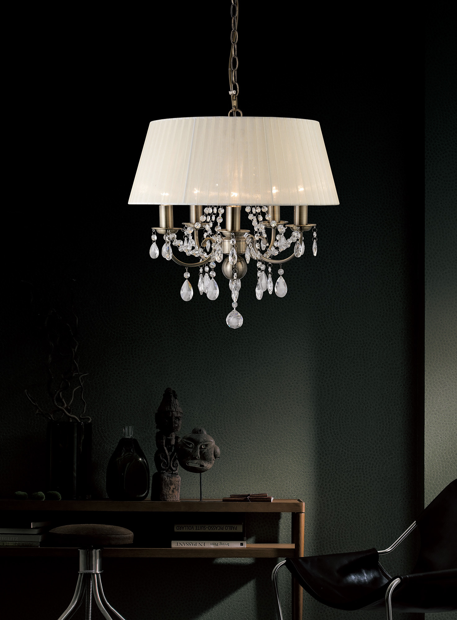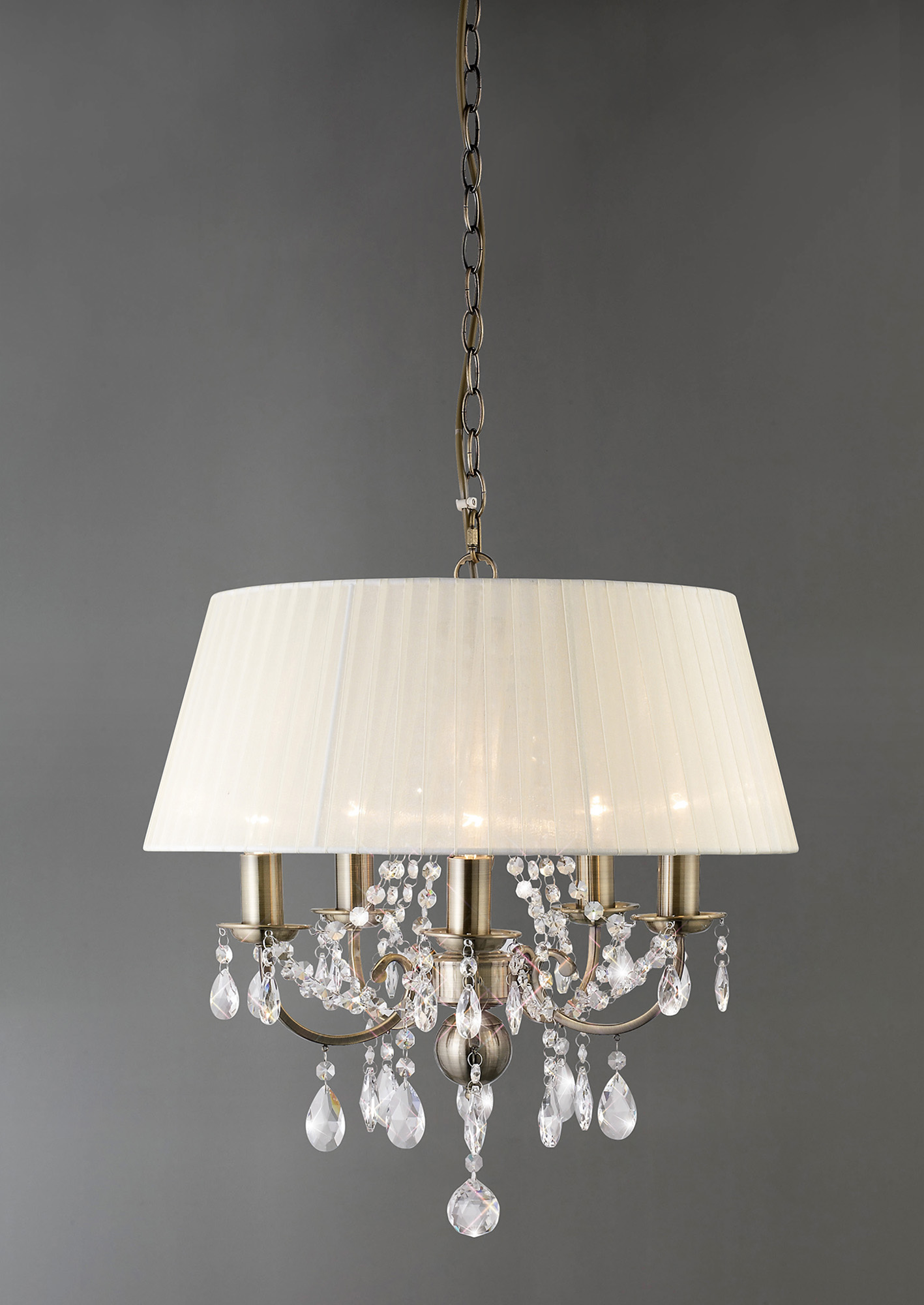 Classic Antique Brass Flemish Design Chandelier With Stunning Asfour Detail Complete With Cream Shade, A gorgeous collection of 5 lights pendants in a Polished Chrome or Antique Brass finish. The frames are dressed in Asfour Crystals and complimented with a fabric Gauze shade allowing maximum light output.