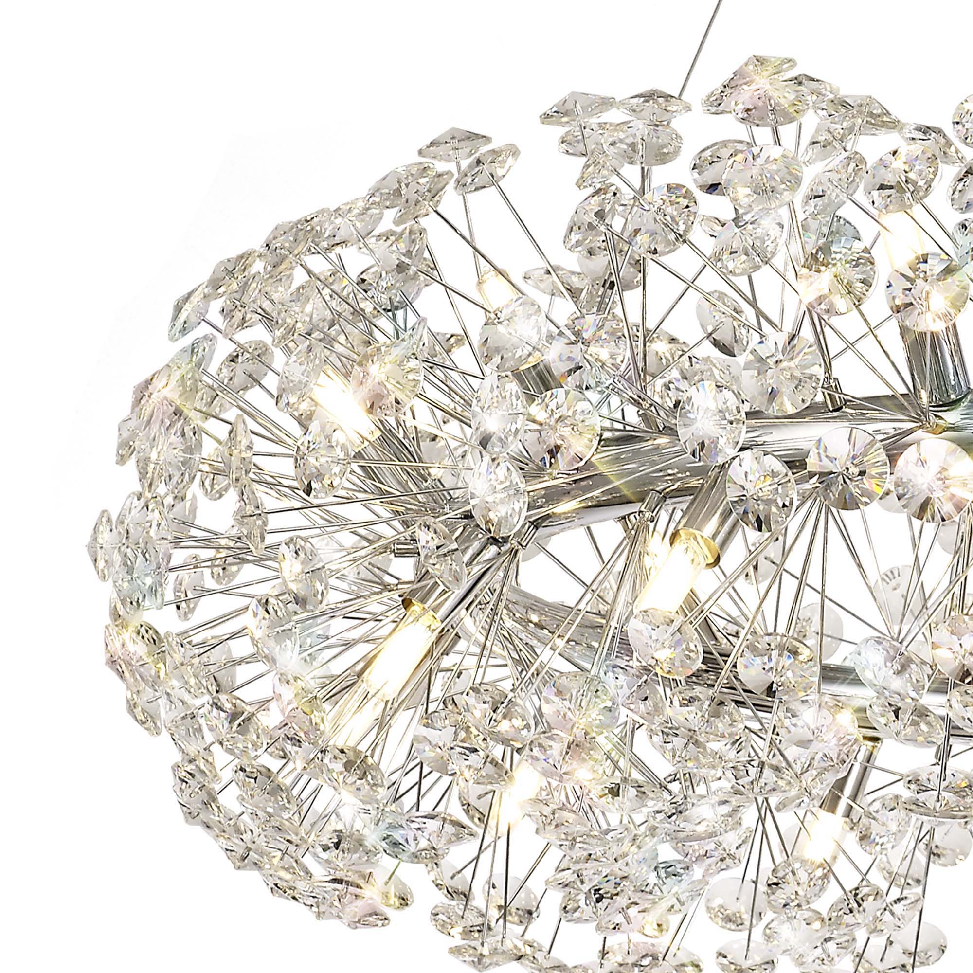This beautiful comprehensive collection available in either a polished chrome or french gold colour finish, uses slim stems angled erratically to form an enchanting cluster of clear crystal disks. The lines of the central framework of round, tiered and oblong pendants, act as a base from which the crystals can sit around the G9 lampholders ensuring the light emitted from the chosen lamp refracts through each facette throwing sublime spectrums.