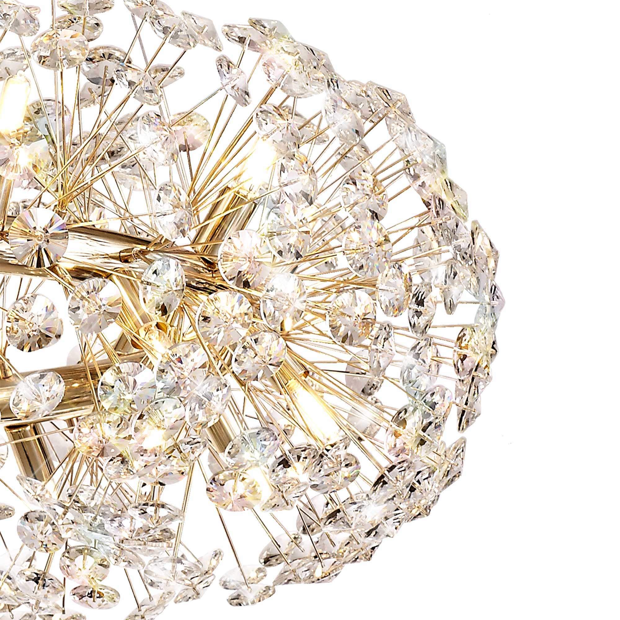 This beautiful comprehensive collection available in either a polished chrome or french gold colour finish, uses slim stems angled erratically to form an enchanting cluster of clear crystal disks. The lines of the central framework of round, tiered and oblong pendants, act as a base from which the crystals can sit around the G9 lampholders ensuring the light emitted from the chosen lamp refracts through each facette throwing sublime spectrums