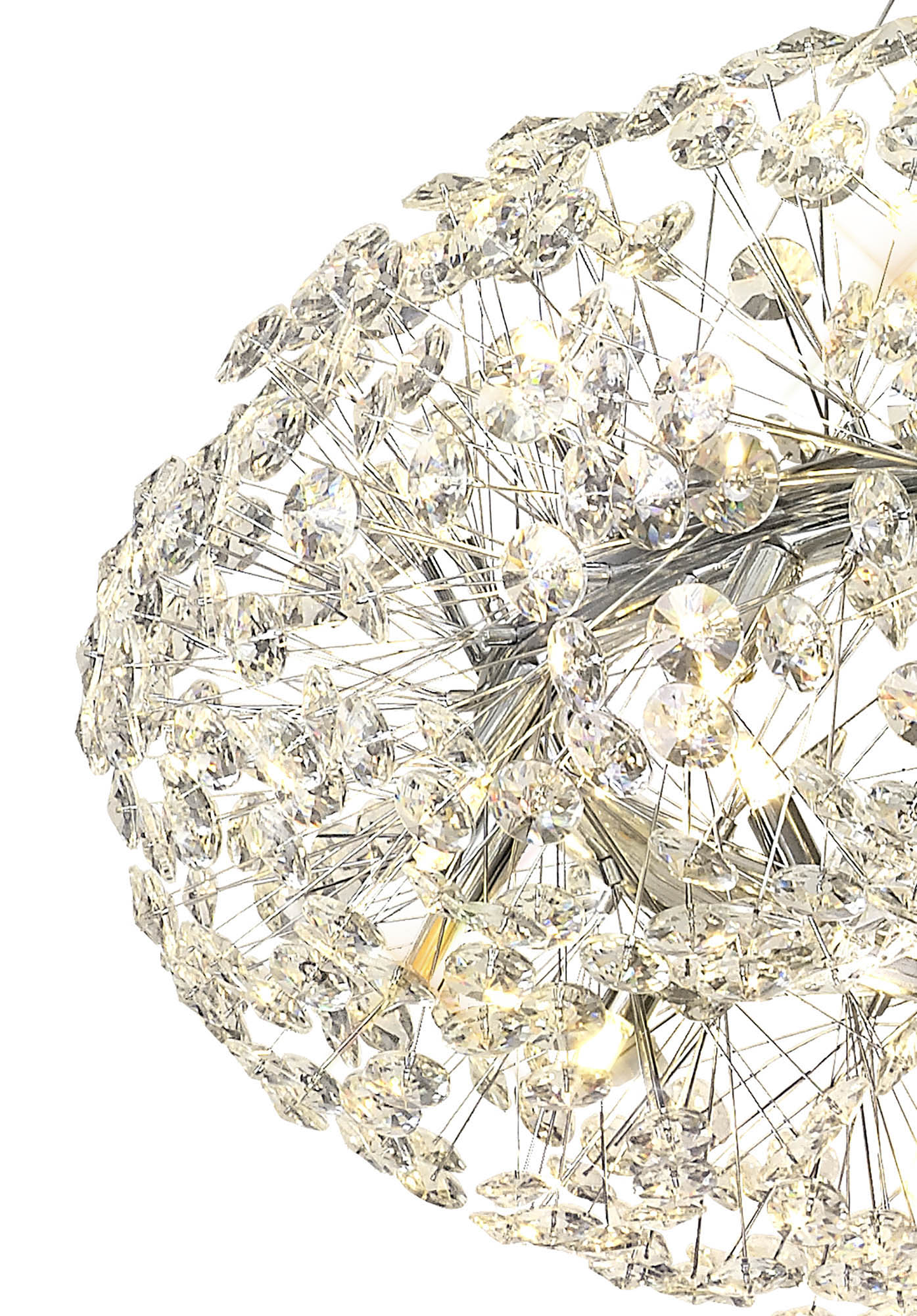 This beautiful comprehensive collection available in either a polished chrome or french gold colour finish, uses slim stems angled erratically to form an enchanting cluster of clear crystal disks. The lines of the central framework of round, tiered and oblong pendants, act as a base from which the crystals can sit around the G9 lampholders ensuring the light emitted from the chosen lamp refracts through each facette throwing sublime spectrums.