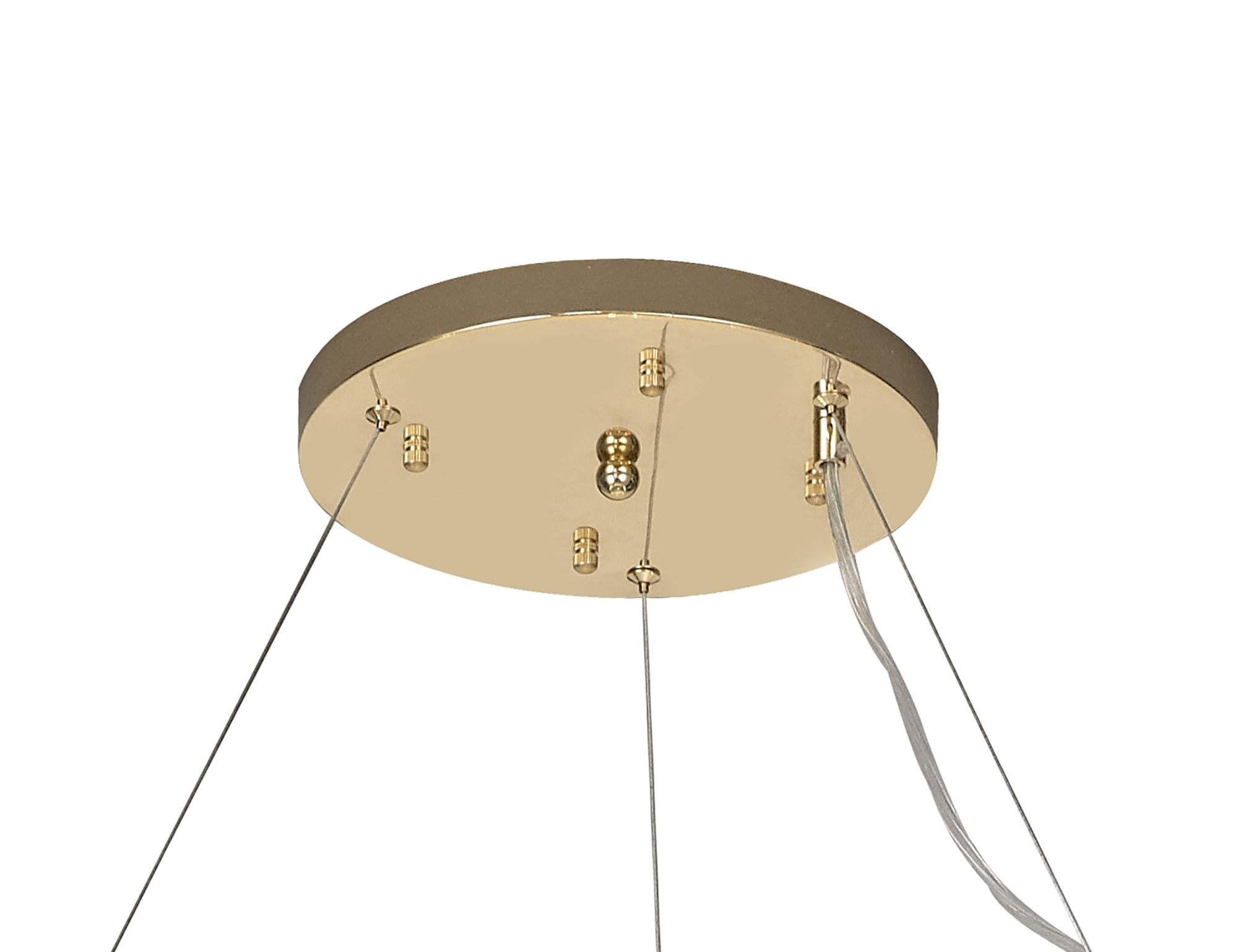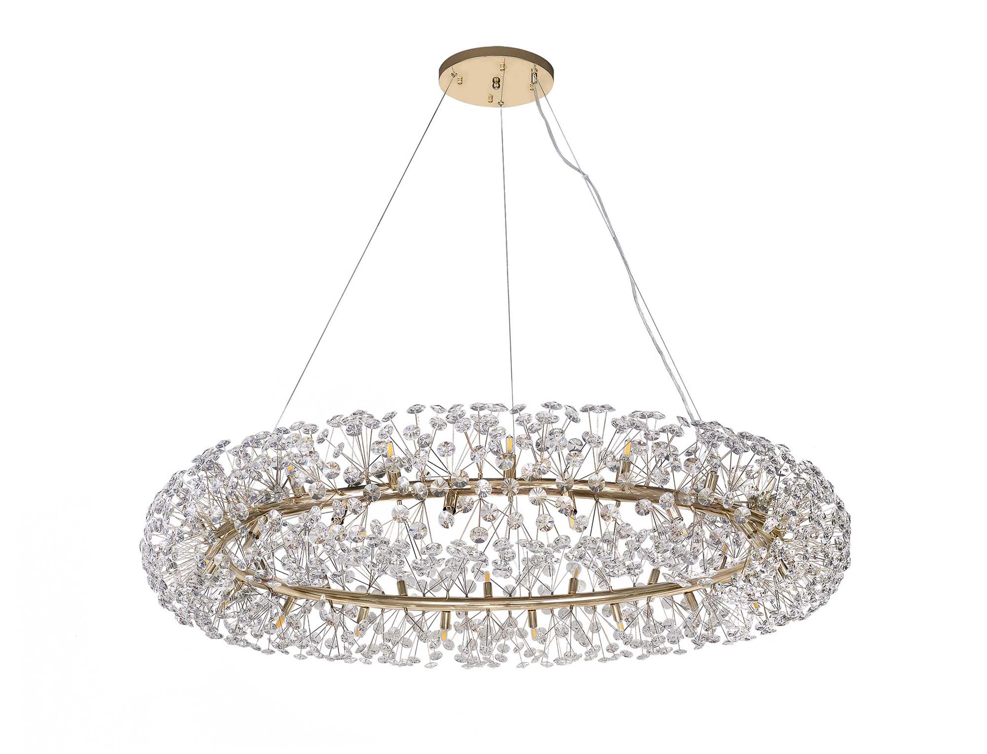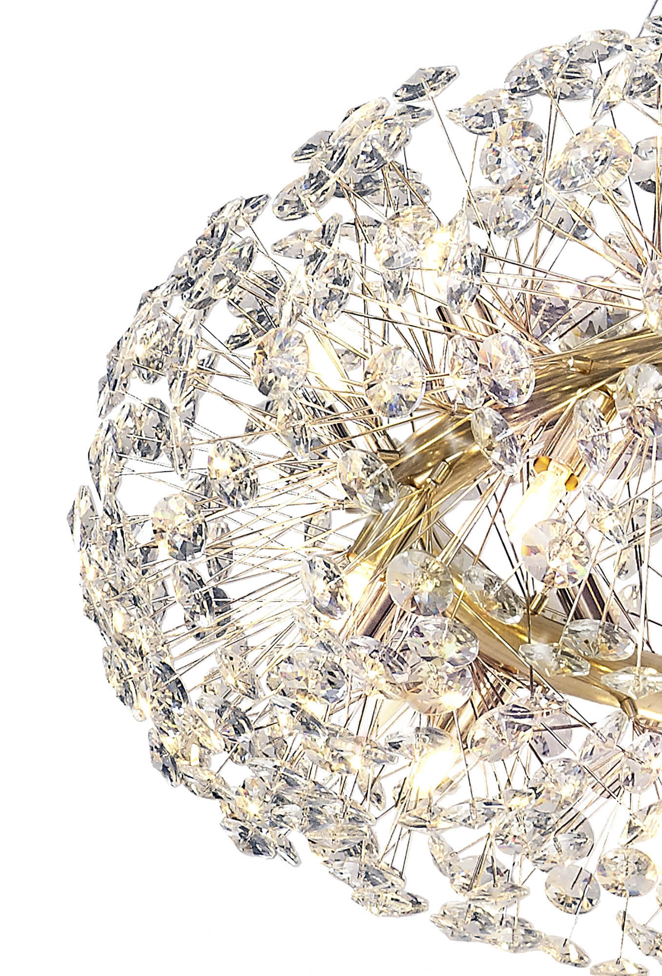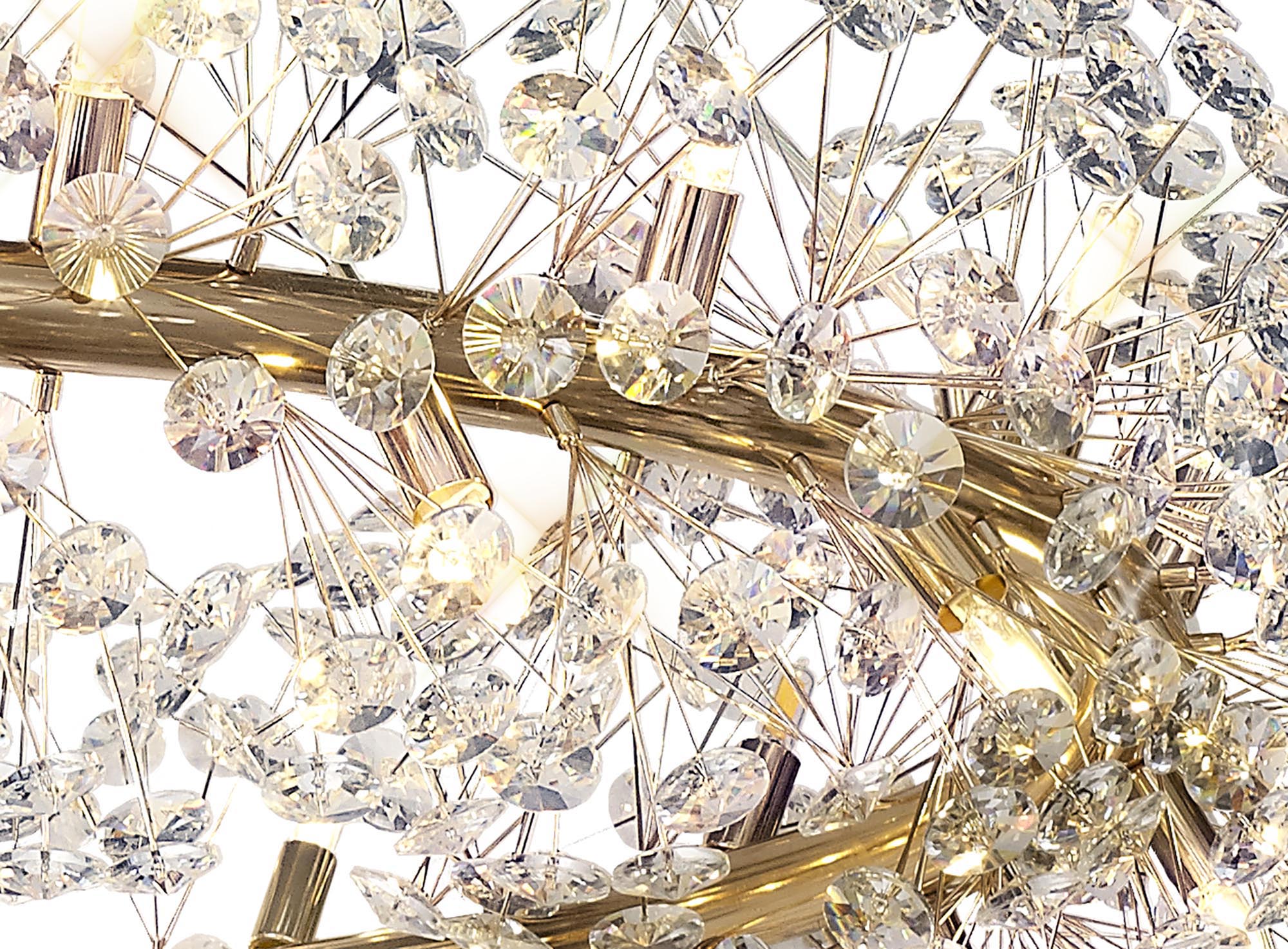 This beautiful comprehensive collection available in either a polished chrome or french gold colour finish, uses slim stems angled erratically to form an enchanting cluster of clear crystal disks. The lines of the central framework of round, tiered and oblong pendants, act as a base from which the crystals can sit around the G9 lampholders ensuring the light emitted from the chosen lamp refracts through each facette throwing sublime spectrums.