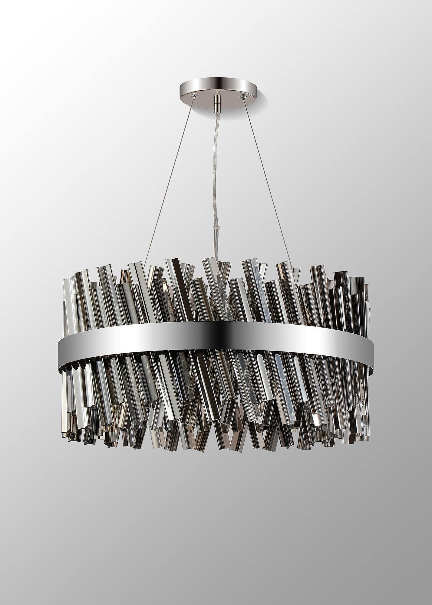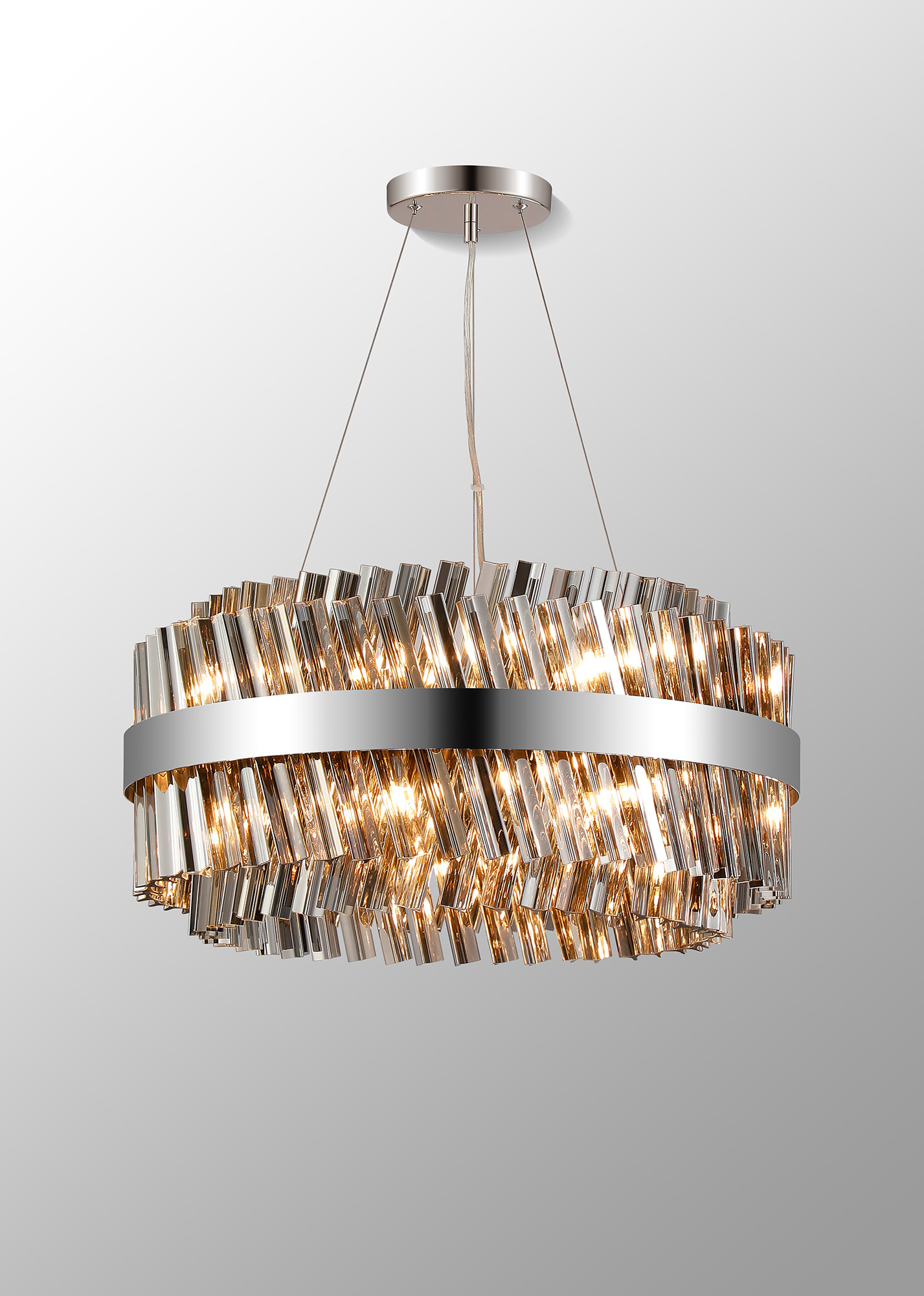 Cali offers a wide variety of frame and glass colour combinations. Of the three frame colours; satin black, polished nickel and brass, there are an equal number of glass to choose from; clear, smoked or amber. One of the most unique selling points of this collection is the dual application of how the mixture of long and short glass are fitted to the lights, giving two visual options. Every frame from the pendants to floor lamps can situate the glass either all vertically for a clean cylindrical outline or at a diagonal angle creating a more uneven decorative effect.