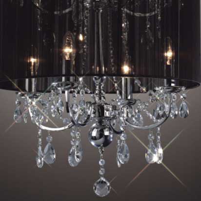 This amazing crystal chandelier is finished in polished chrome with a black silk string cyclinder shade complete with stunning asfour crystals.