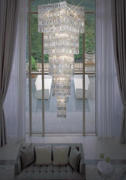 A smart range of Polished Chrome fittings fully loaded with rectangular crystal drops. The 5 light is especially designed for lower ceilings and the wall lamp is individually switched. The magnificent 11 or 15 light are real show stopper