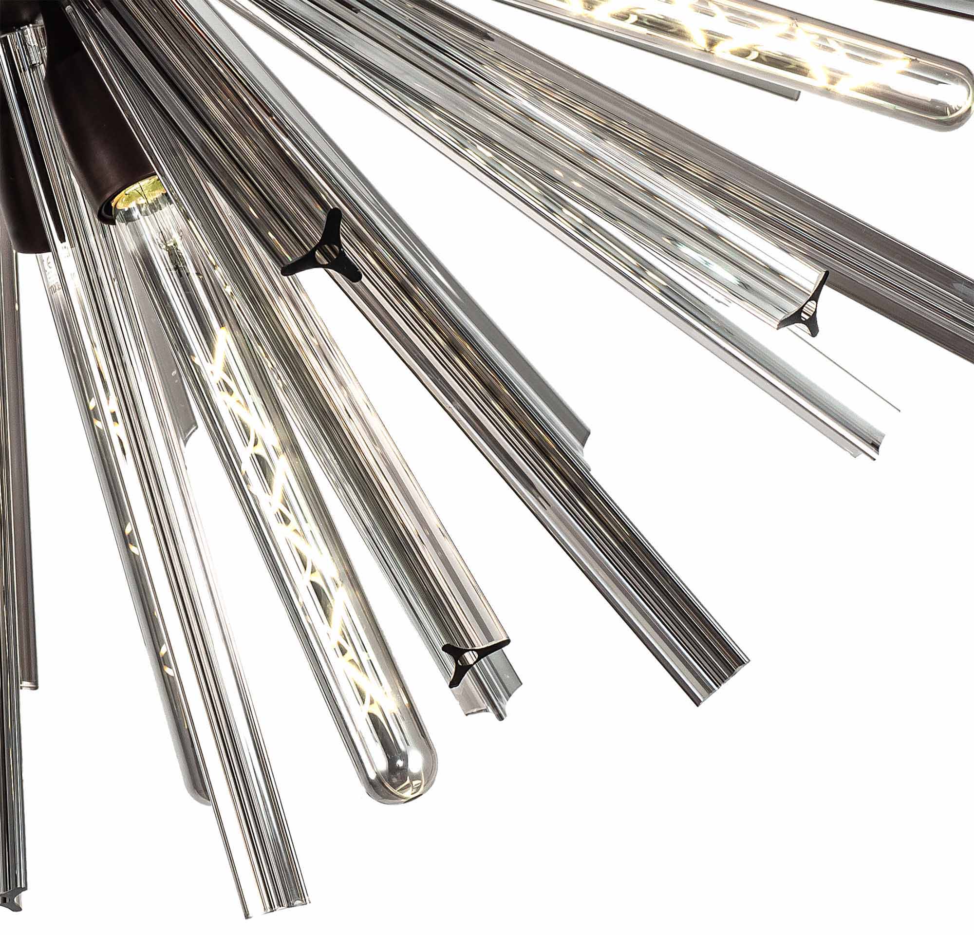The Cleo collection presents an intriguing glass shape moulded into a three dimensional triquetra. The grooves along each sized glass create an appealing optical effect which is effortlessly enhanced with the use of tubular lamps.
