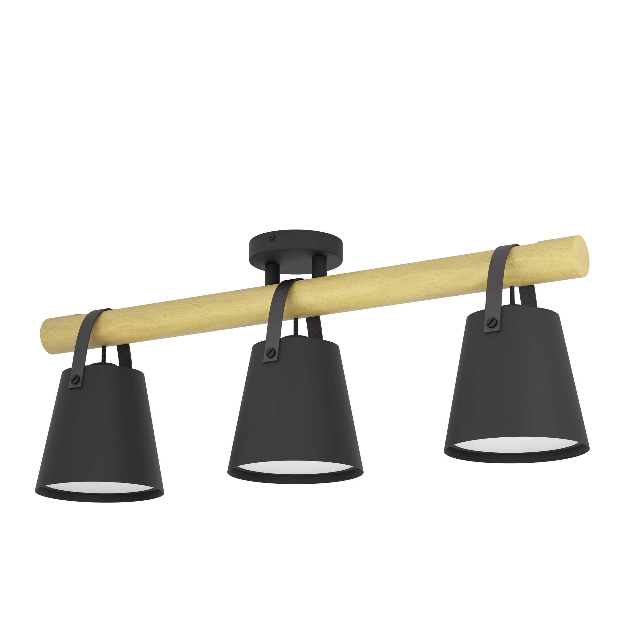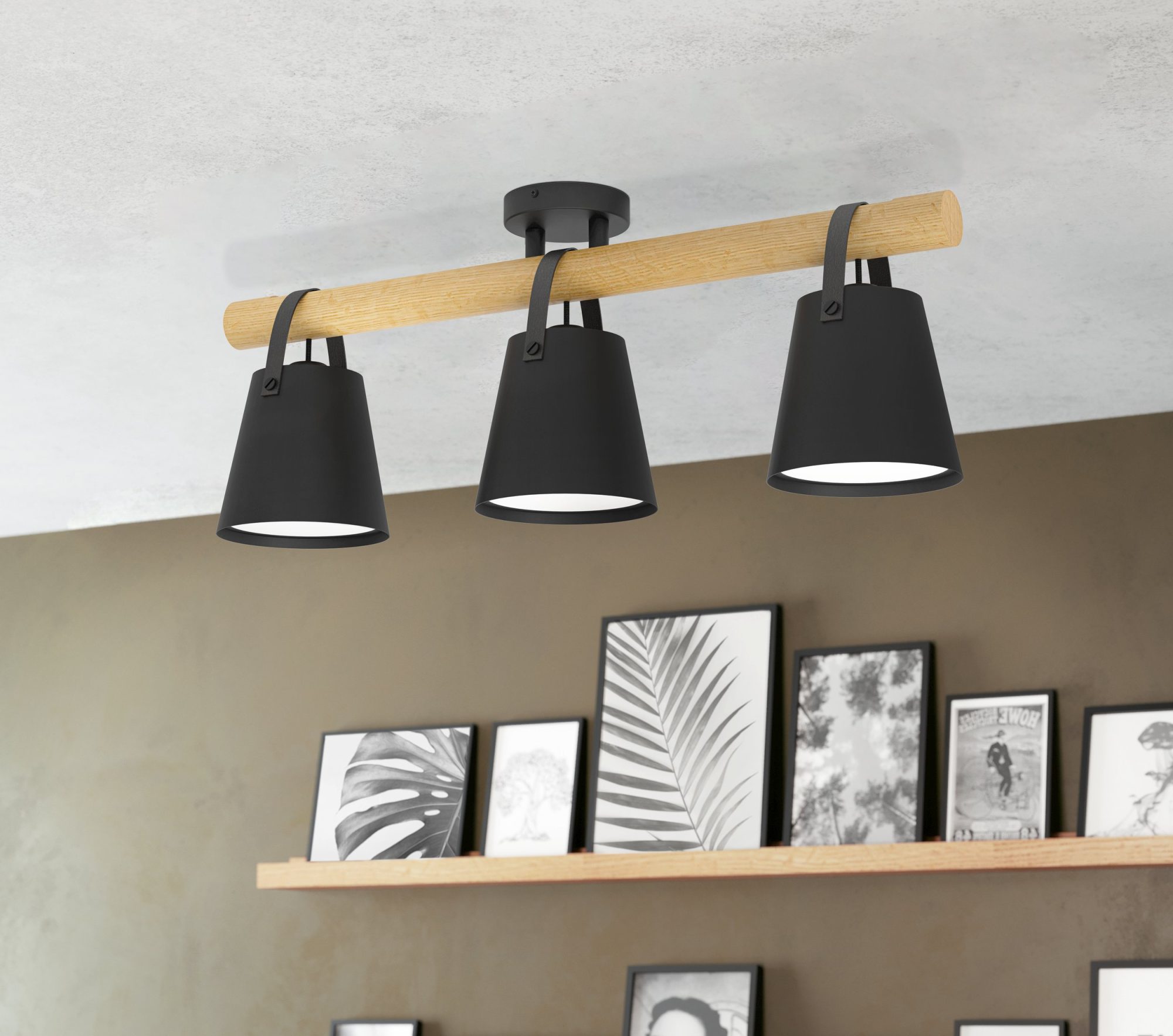 This ceiling light has a black metal base featuring a rubberwood crosspiece with three metal lampshades attached. The three black shades are secured with artificial black leather straps, giving the light a trendy look. With an inner white lining of the shades, the white plastic diffuser underneath creates effective and uniform light, and with its compelling mix of wood, metal and leather, the ceiling light blends beautifully into modern interiors. It provides cosy lighting in the living room, bedroom, dining room or hallway.
