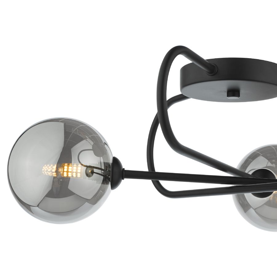 The Eissa semi-flush ceiling light in matt black with smoked glass follows the current geometric minimalist design trend with a large radius arms leading to a beautiful mirror smoked glass. The Eissa semi-flush ceiling light is part of a range including a matching wall light and table lamp.