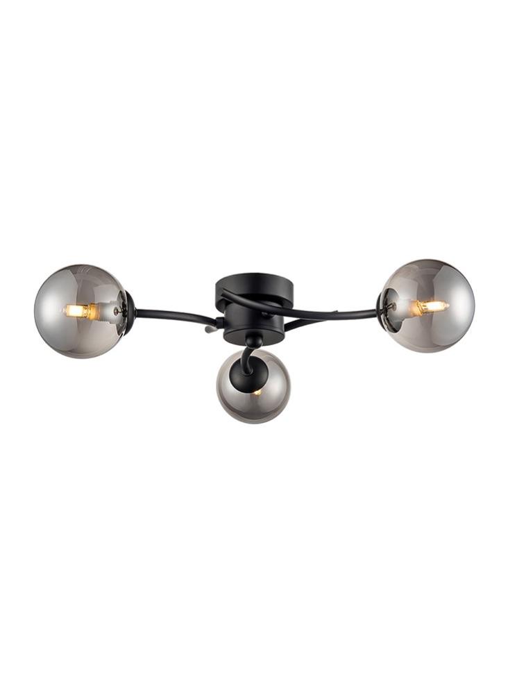 Modern matt black ceiling light with smoked glass spheres, ideal for lounge, dining room or hallway lighting & perfect for modern homes with lower ceiling heights, full range available inc floor lamps & wall lights