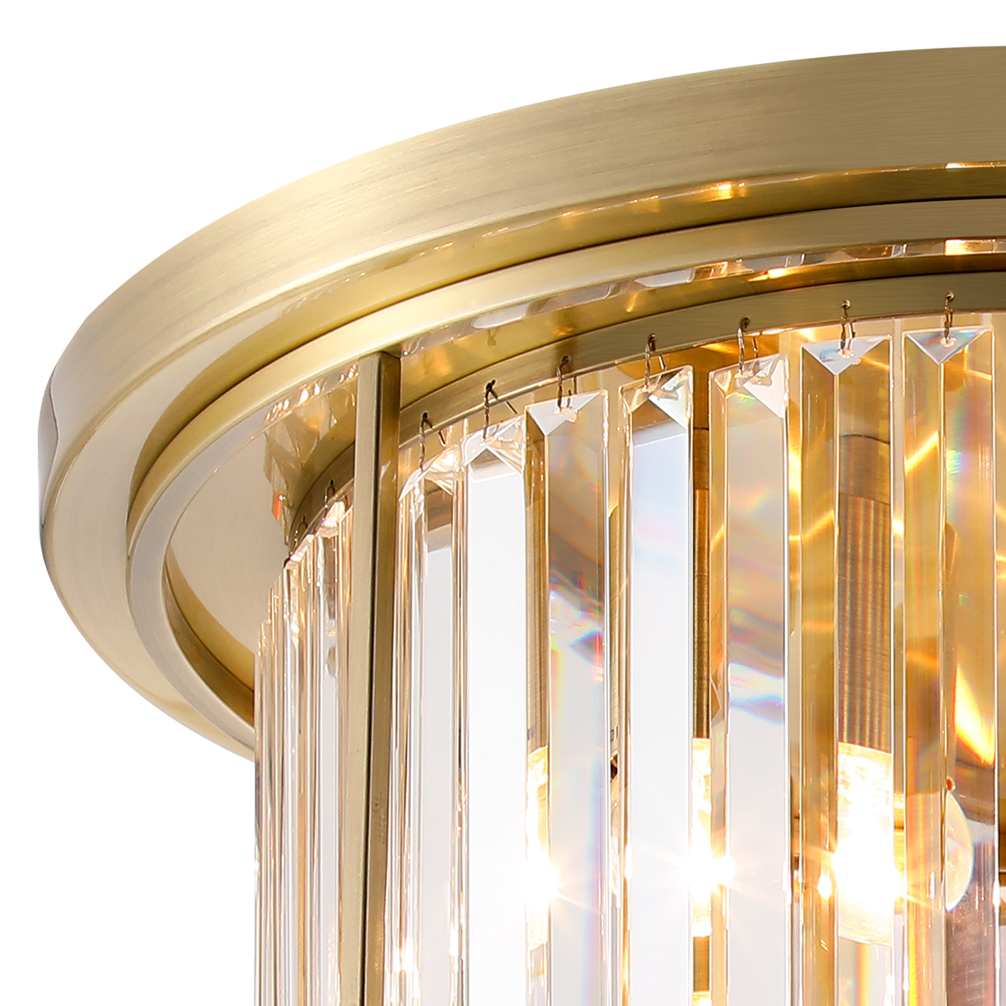 Flush crystal ceiling light, finished in Antique Brass with continuous flow of crystals, ideal for homes with lower ceiling heights. Looks stunning a centre piece in the lounge or bedroom but also works well in dining rooms and hallways.