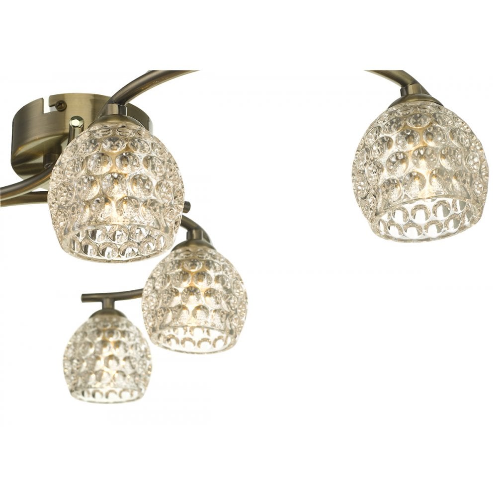 The DKAN106475-06 6 light semi flush ceiling light in antique brass and clear glass shades. The heavy glass pressed glass shades of the Nakita semi flush ceiling light have deep circular impressions giving a bubble light appearance that gives an interesting and beautiful lighting effect when on and still glistens in ambient light when off. The polished chrome finish is our most popular finish, it’s reflective finish looking great against any colourway..