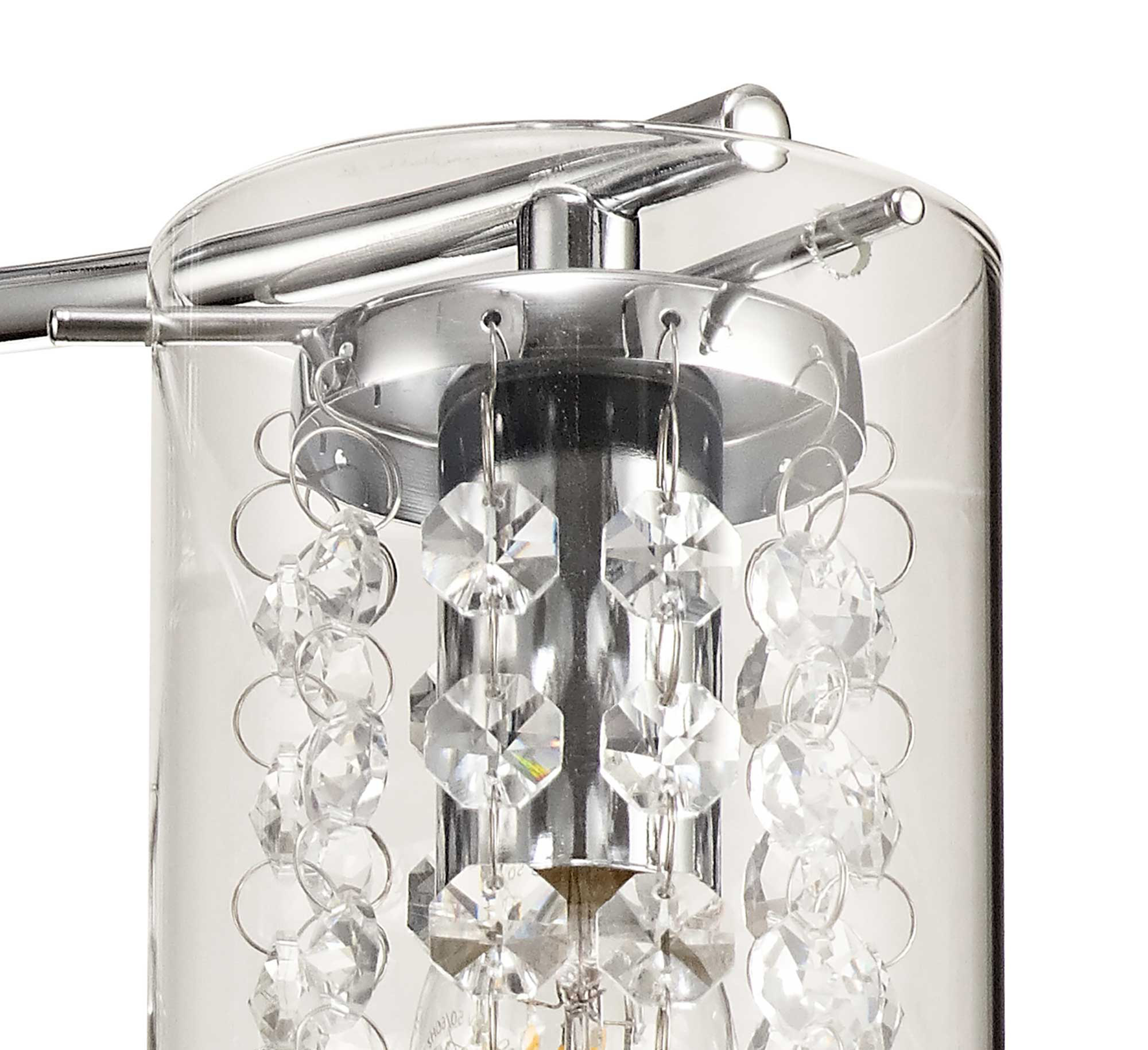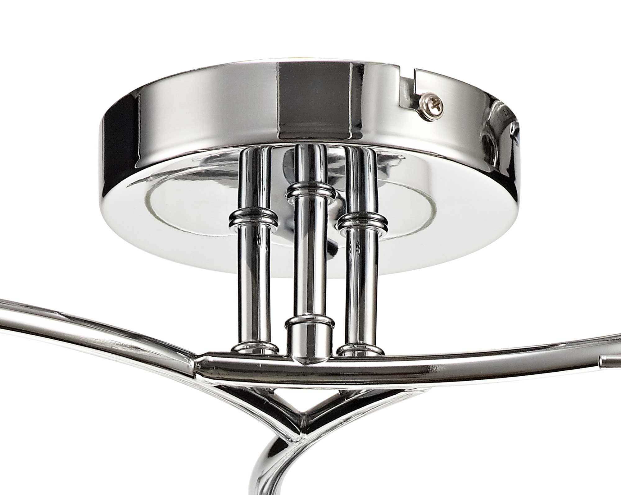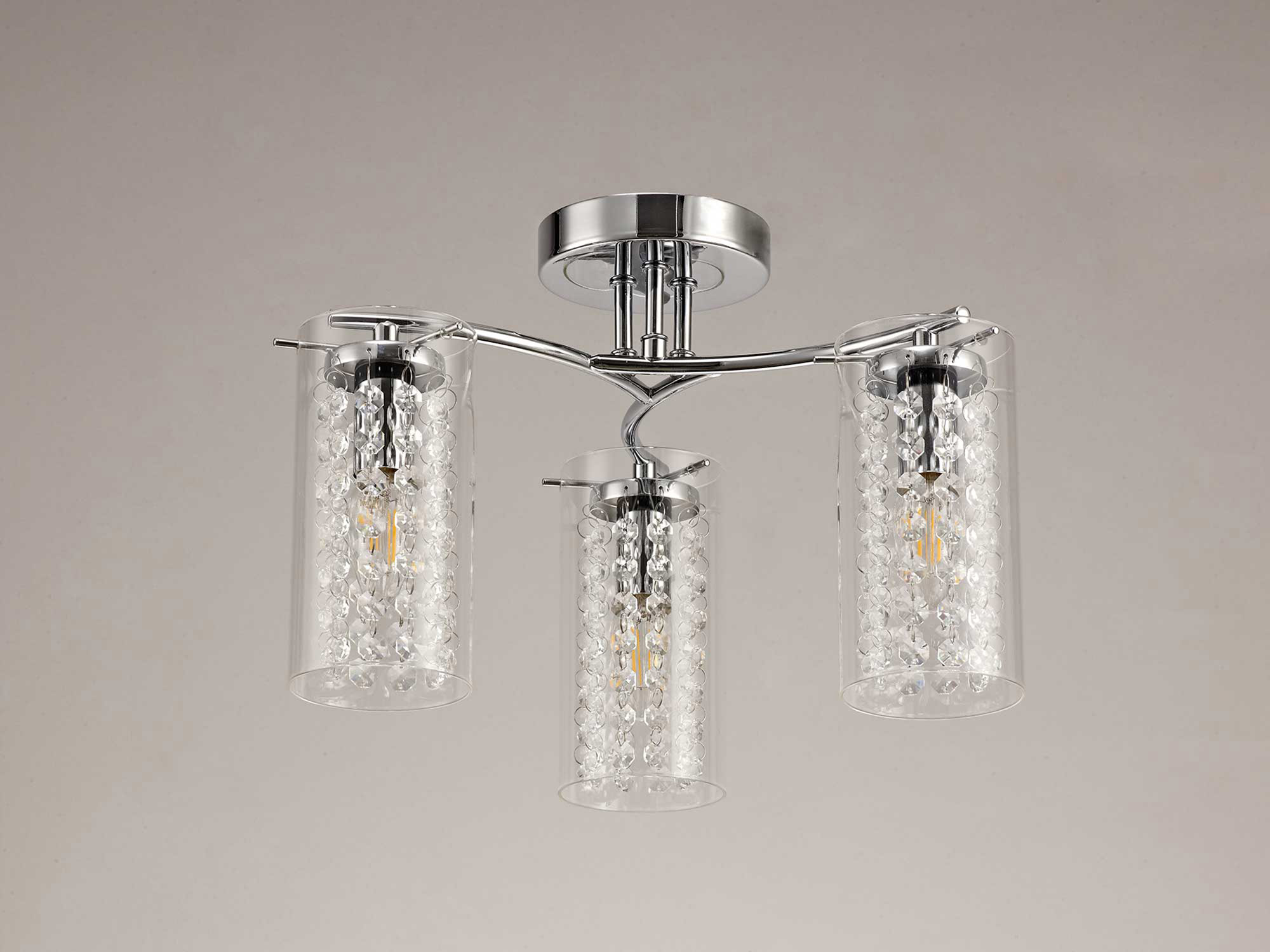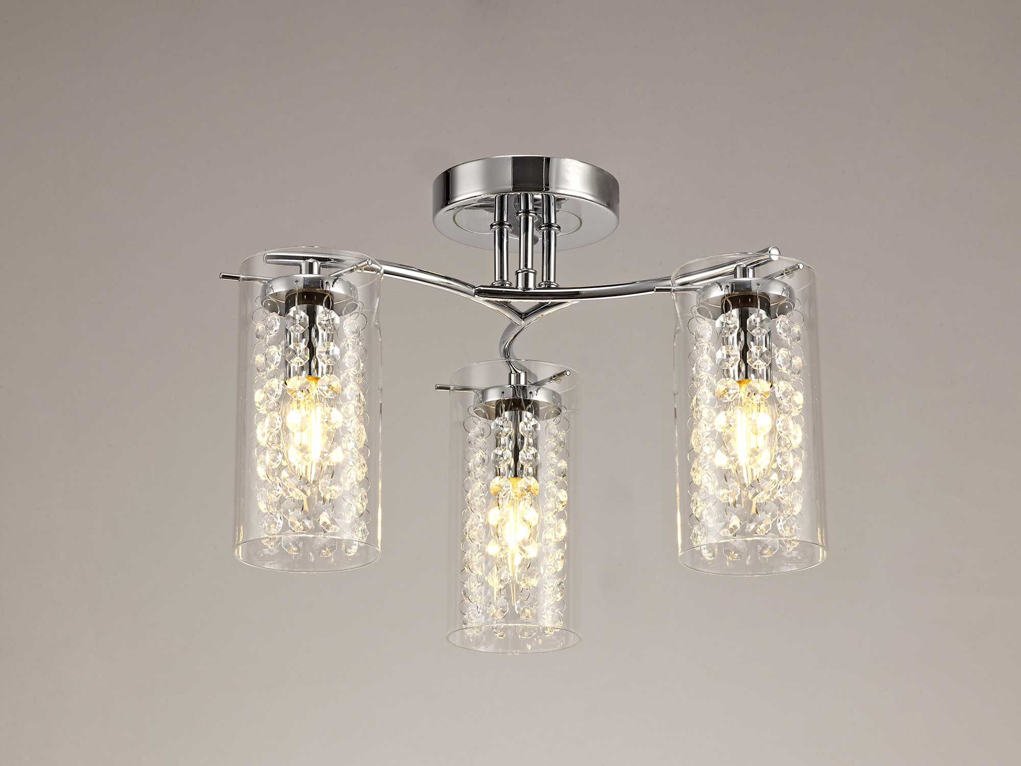 The Parris semi ceiling lights use stylish slim waved arms in polished chrome to hold the E14 lamp holders. Each lamp holder is encircled by a transparent cylindrical glass