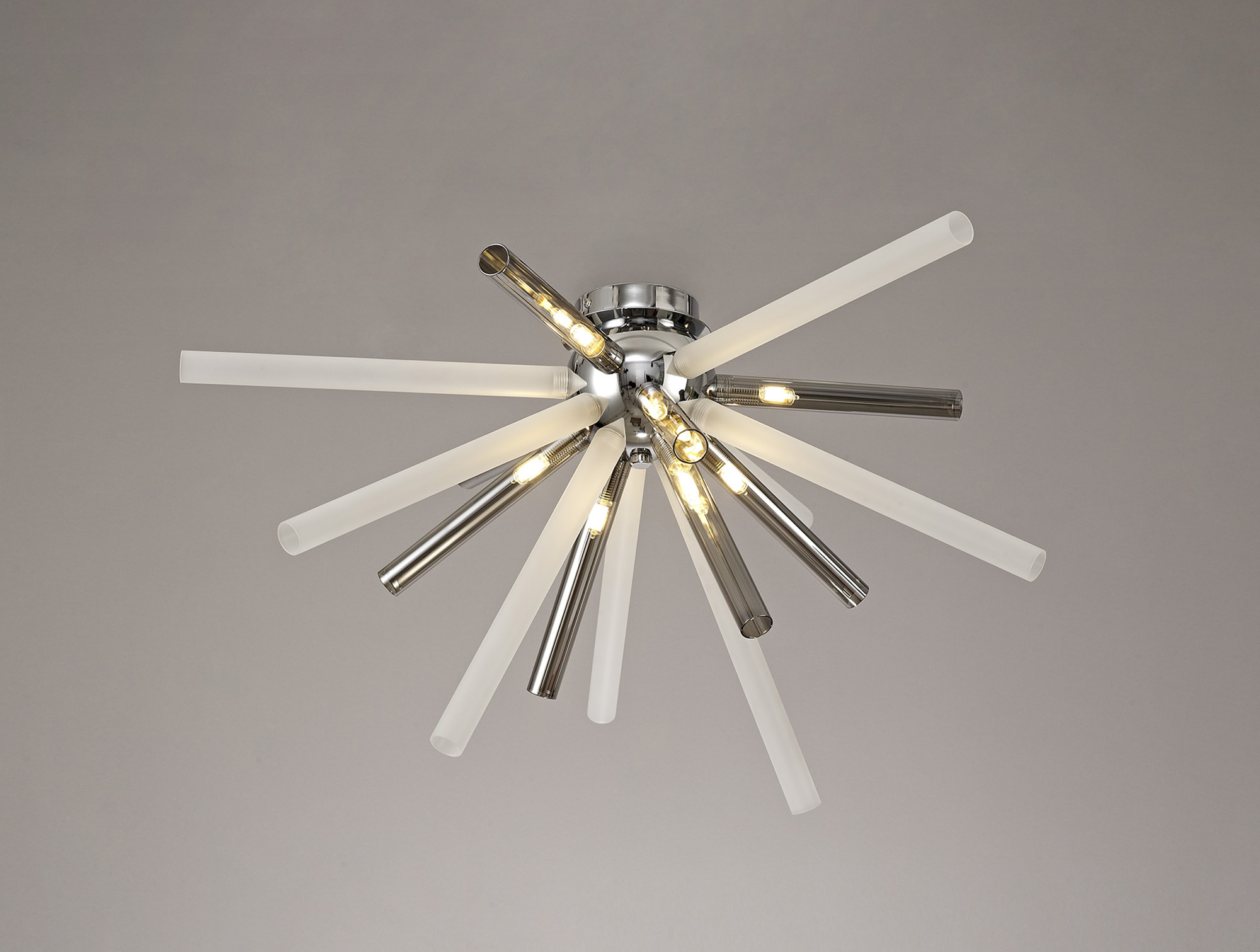 Rods has an abundance of narrow glass tubes in various sizes which are cleverly arranged into a sputnik composition, devising a larger three dimensional effect around the polished chrome central orb frame. With smoked & frosted glass tubes