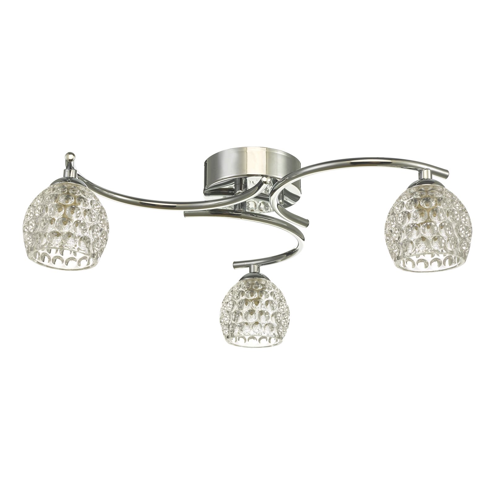 The DKAN105350-06 3 Light Semi Flush ceiling light is finished with a polished chrome frame with 3 heavy clear glass shades surrounding the G9 lamps. The decorative glass shade has a dimpled motif. The graceful curving arms give a generous diameter of 50cm which ensures the light spill covers a larger area and a height of 16cm make this a great choice for low ceiling areas.