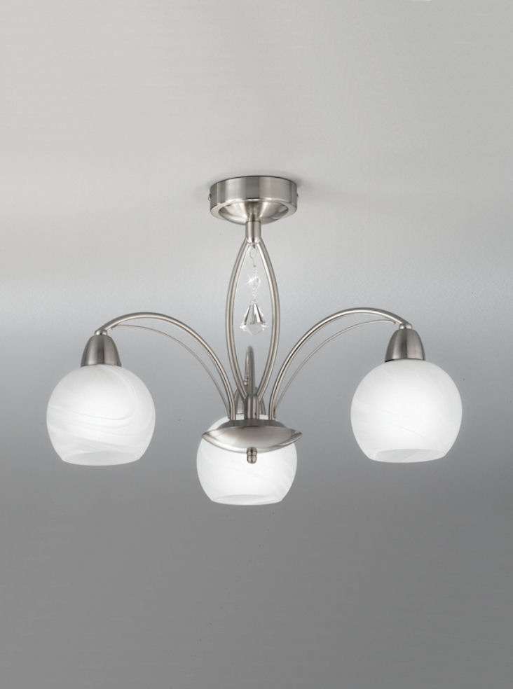 This stunning ceiling light is finished in Satin Nickel with alabaster glass shades with crystal droplets. this fitting is supplied with chain but can easily be converted to flush mounted for low ceilings.