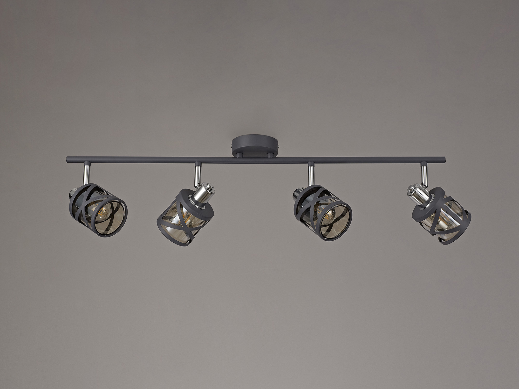 An exquisitely intricate frame crosses over the tinted cylindrical glass which houses E14 lampholders. All seven designs in the Nivern range are available in either a matt grey or polished chrome finish with cognac glass