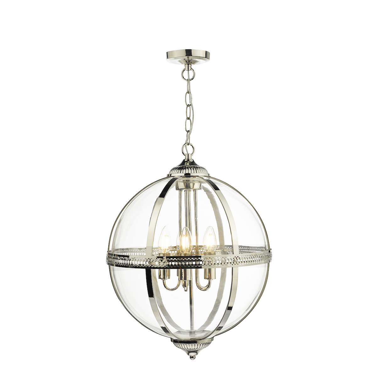This three-light decorative pendant features a spectacular orb glass shade with intricate polished nickel metal work.