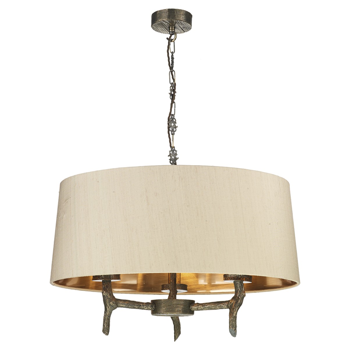 The rustic Joshua range finished in Aged Bronze supplied with Taupe silk shades with Bronze lining.