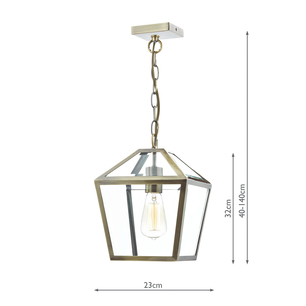 The angular aesthetic of the Arch single light lantern brings a modern look for hallways and entrance halls. Simply styled, but nonetheless luxurious, this pendant light features bevelled panes of clear glass in a four-sided, lidded cage structure, finished in warm antique brass.