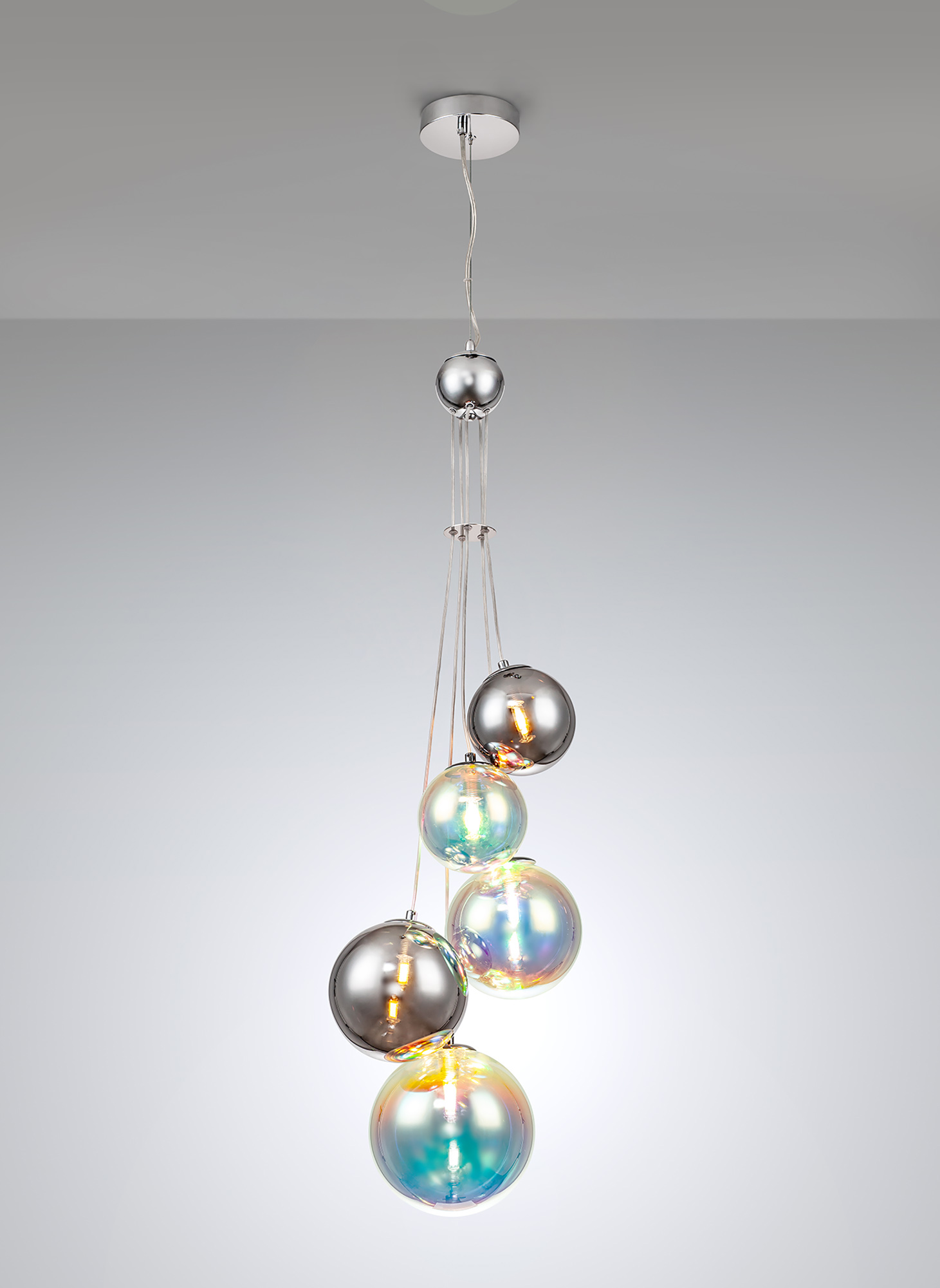 The Moon range has a Polished Chrome base with a collection of different sized glass spheres in Iridescent & smoked.