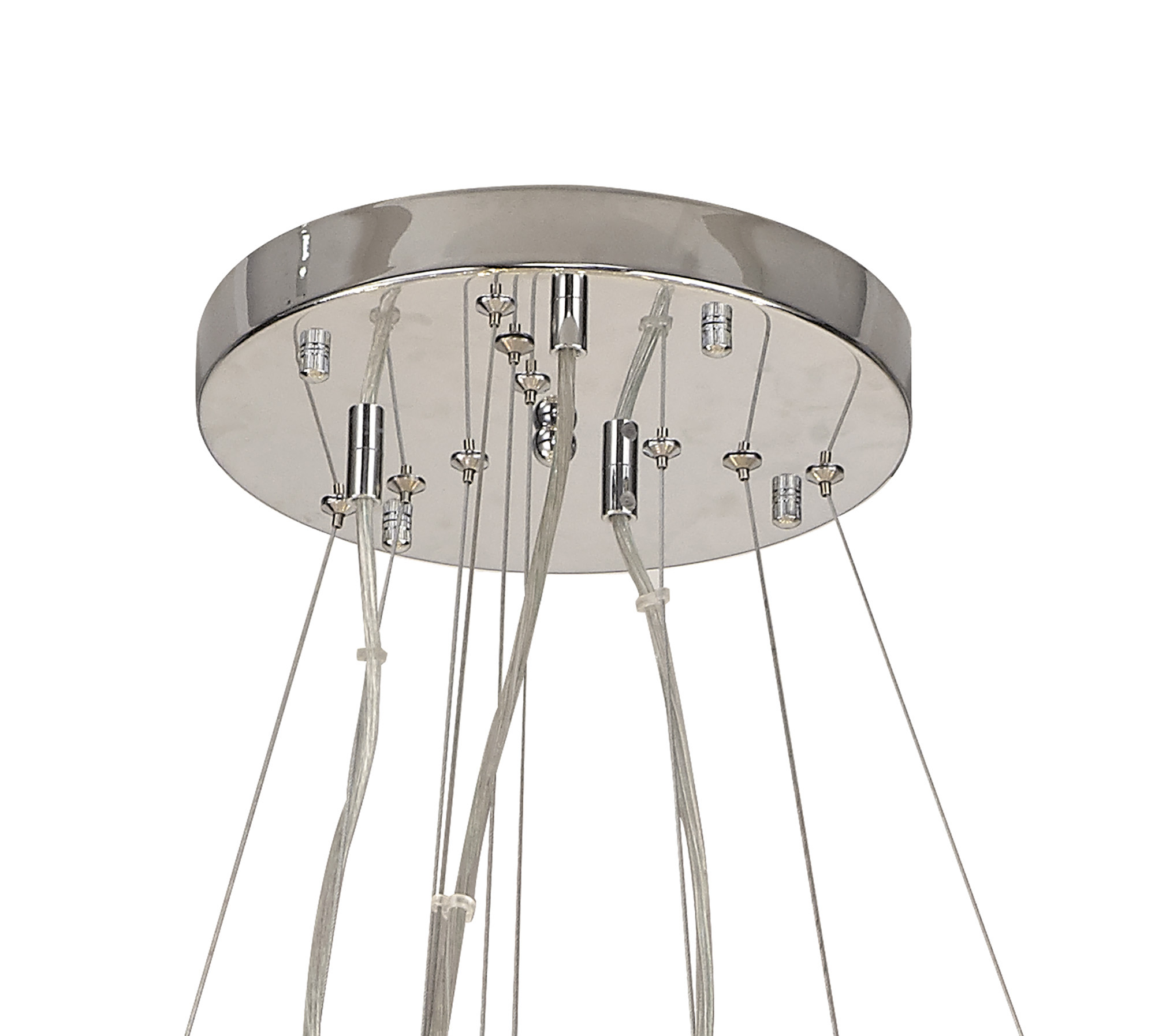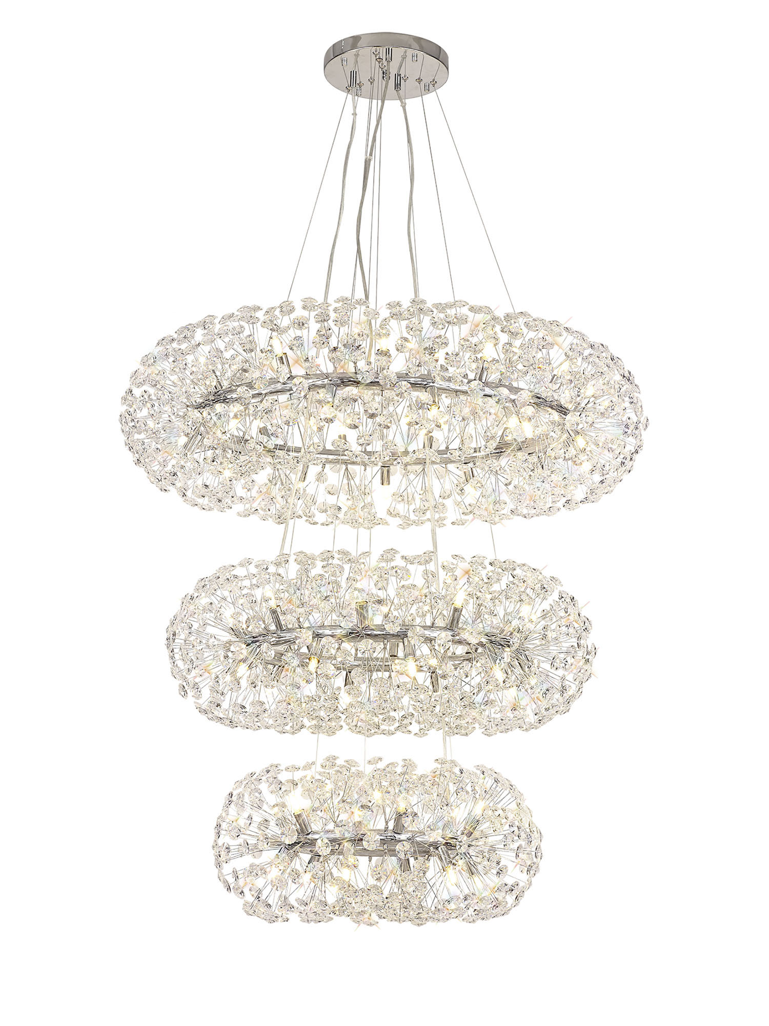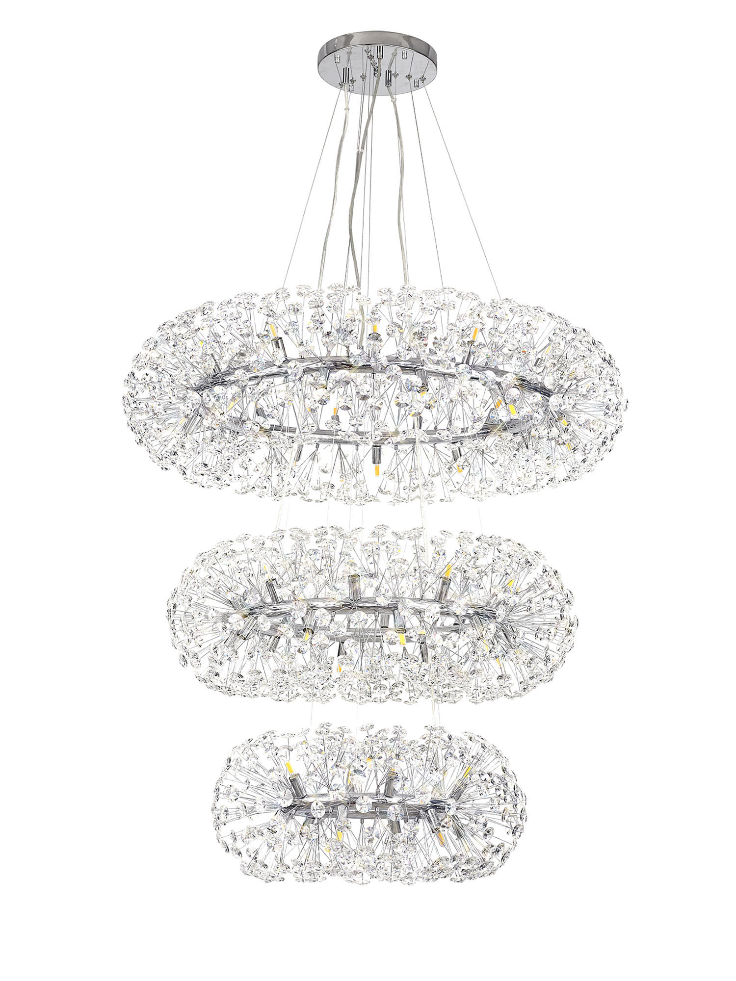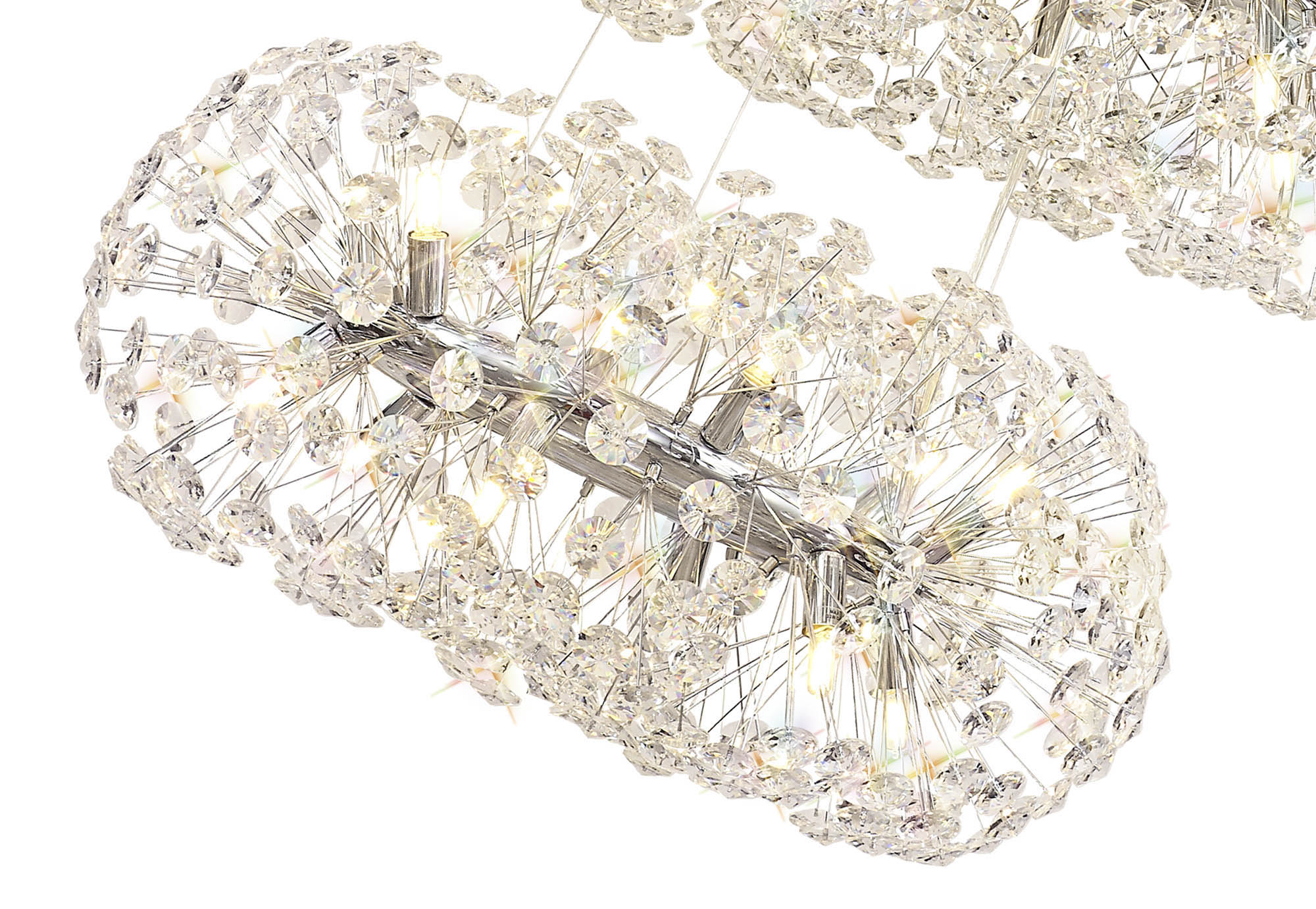 This beautiful comprehensive collection available in either a polished chrome or french gold colour finish, uses slim stems angled erratically to form an enchanting cluster of clear crystal disks. The lines of the central framework of round, tiered and oblong pendants, act as a base from which the crystals can sit around the G9 lampholders ensuring the light emitted from the chosen lamp refracts through each facette throwing sublime spectrums.