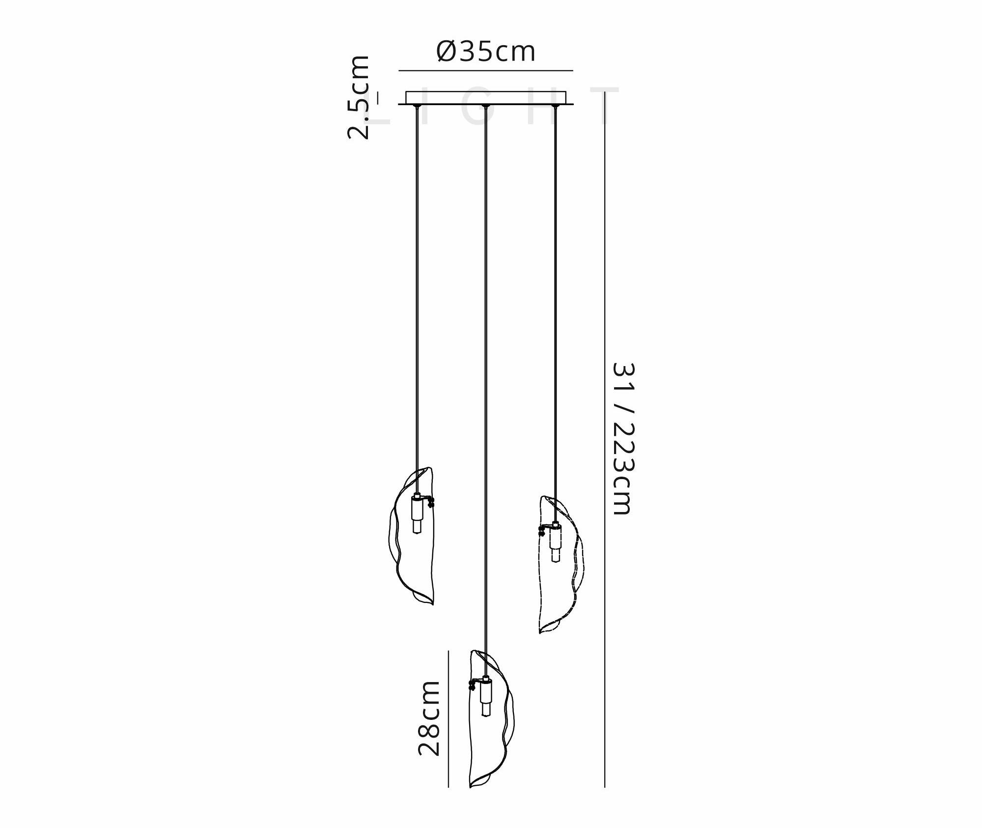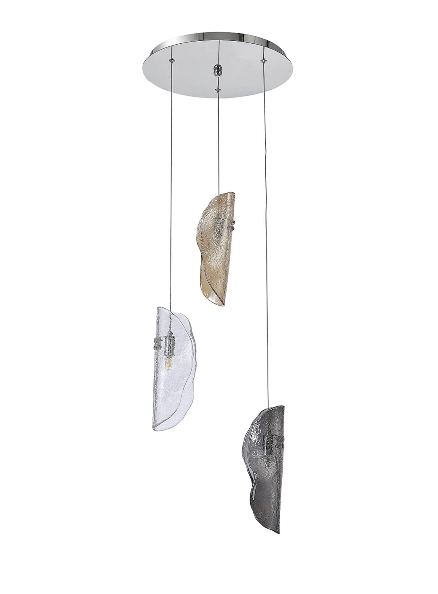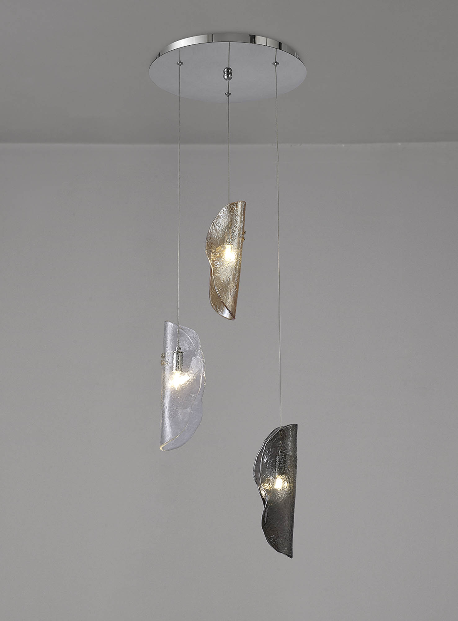 Scroll name is drawn from the wrapped glass pieces which diffuse the light emitted from the G9 lampholders, each suspended from an individual drop. With the picturesque collection of clear, amber and smoked glass a serene ambience is provoked by the textured surface of each glass piece which shimmers beneath the coloured tint like light on water.
