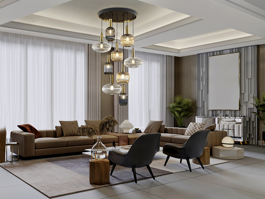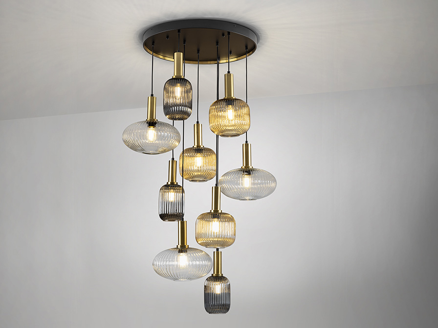 A simple, yet impressive elegant large multi ceiling pendant lamp finished in matt black, with details of antique brass. Included are nine shaped glasses in mixed clear, smoked and cognac.