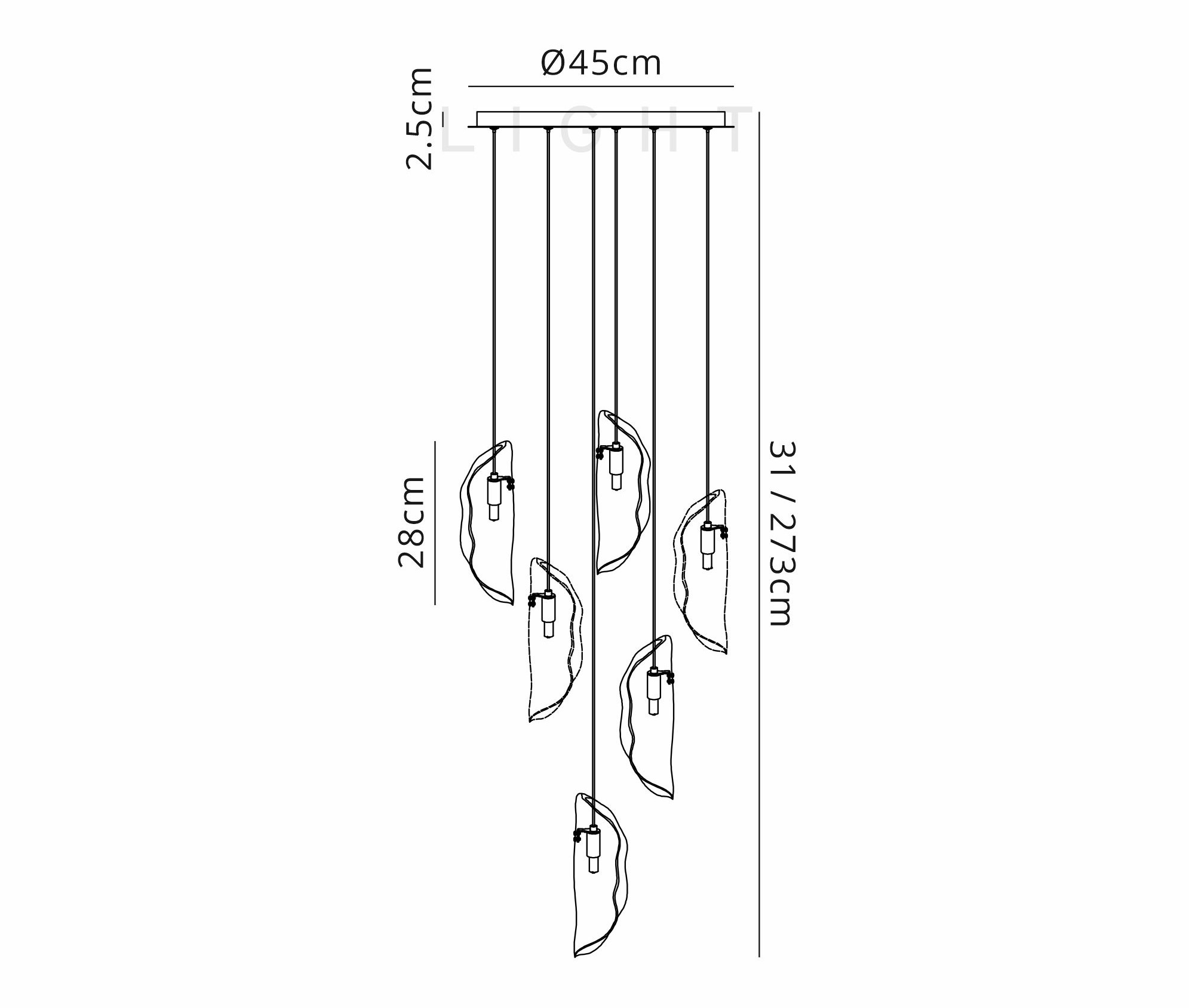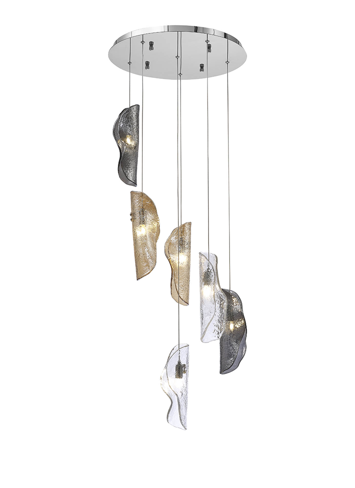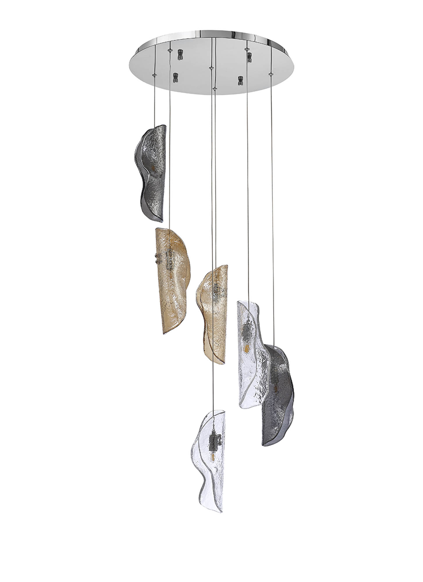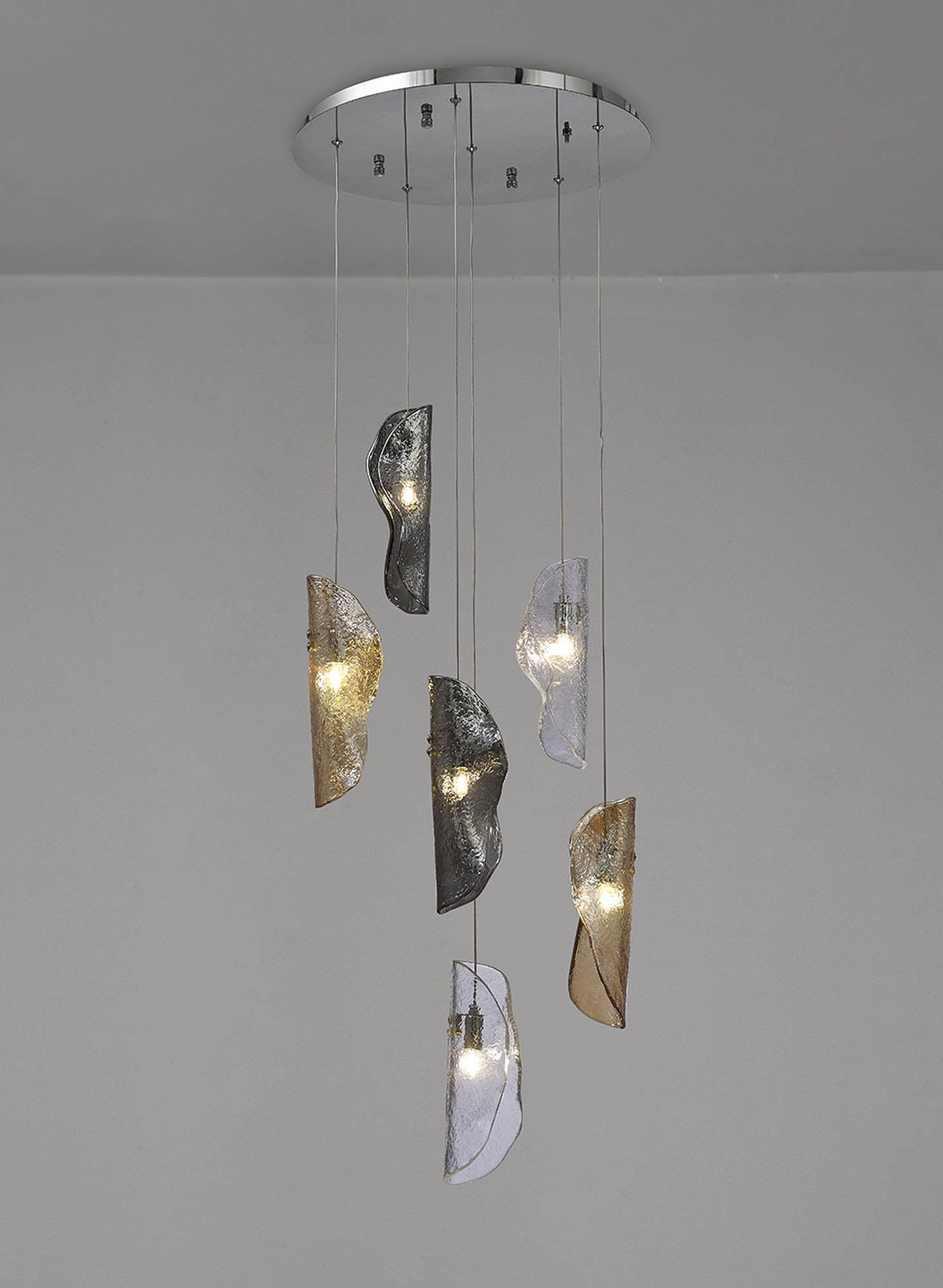 Scroll name is drawn from the wrapped glass pieces which diffuse the light emitted from the G9 lampholders, each suspended from an individual drop. With the picturesque collection of clear, amber and smoked glass a serene ambience is provoked by the textured surface of each glass piece which shimmers beneath the coloured tint like light on water.