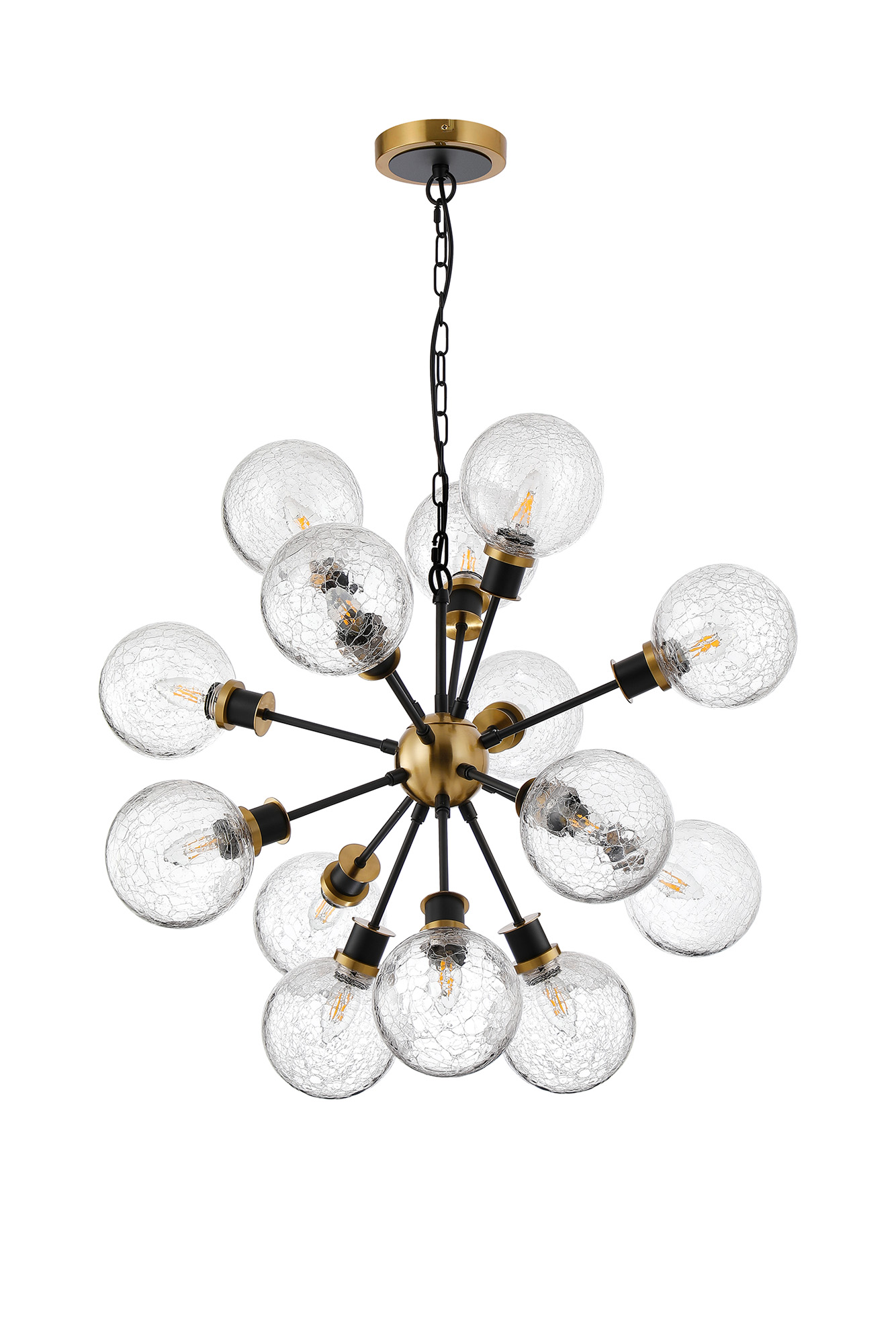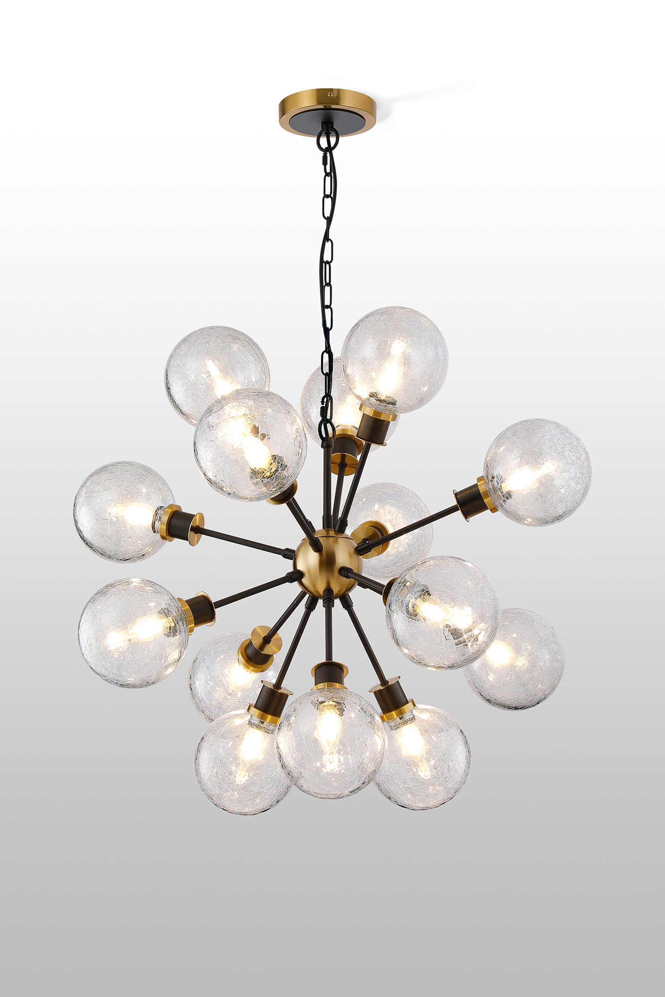 A stunning ceiling pendant, finished in matt black & brass with Crackled clear glass globes