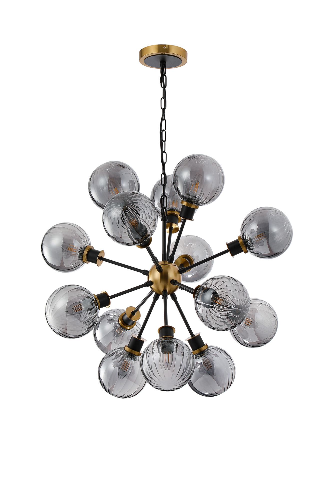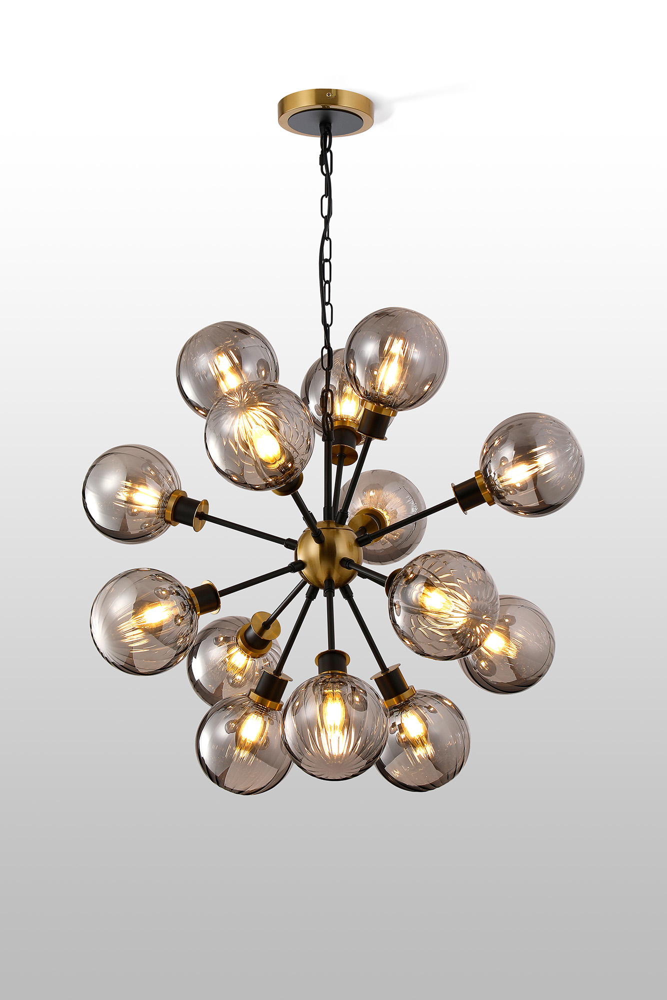 A stunning ceiling pendant, finished in matt black & brass with segment smoked glass globes