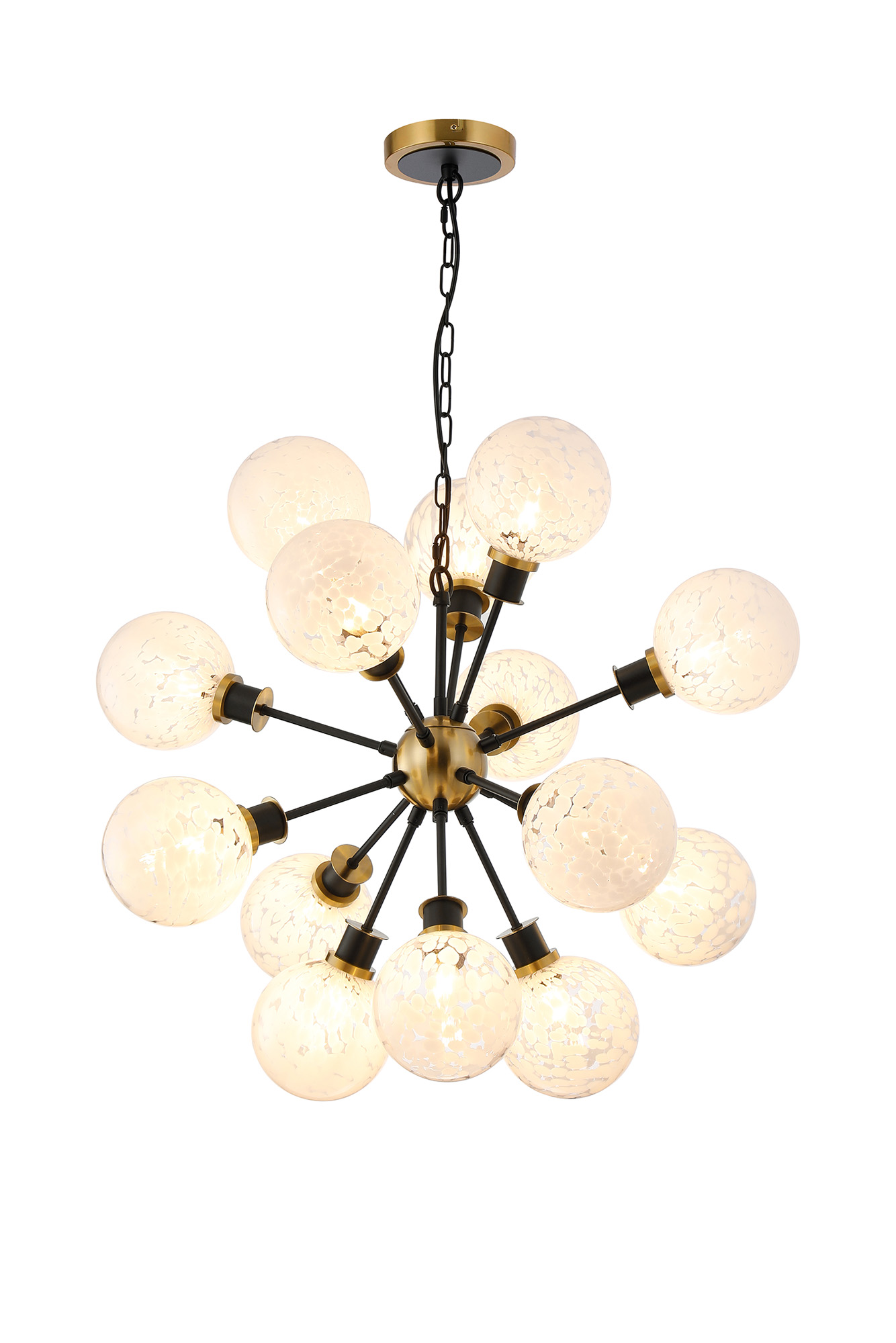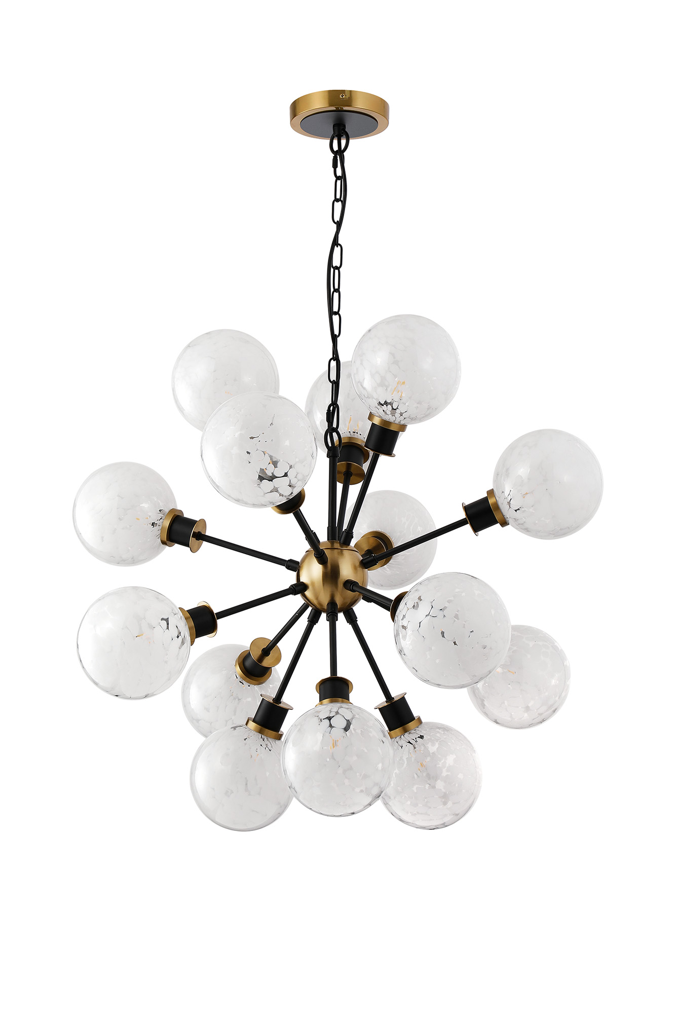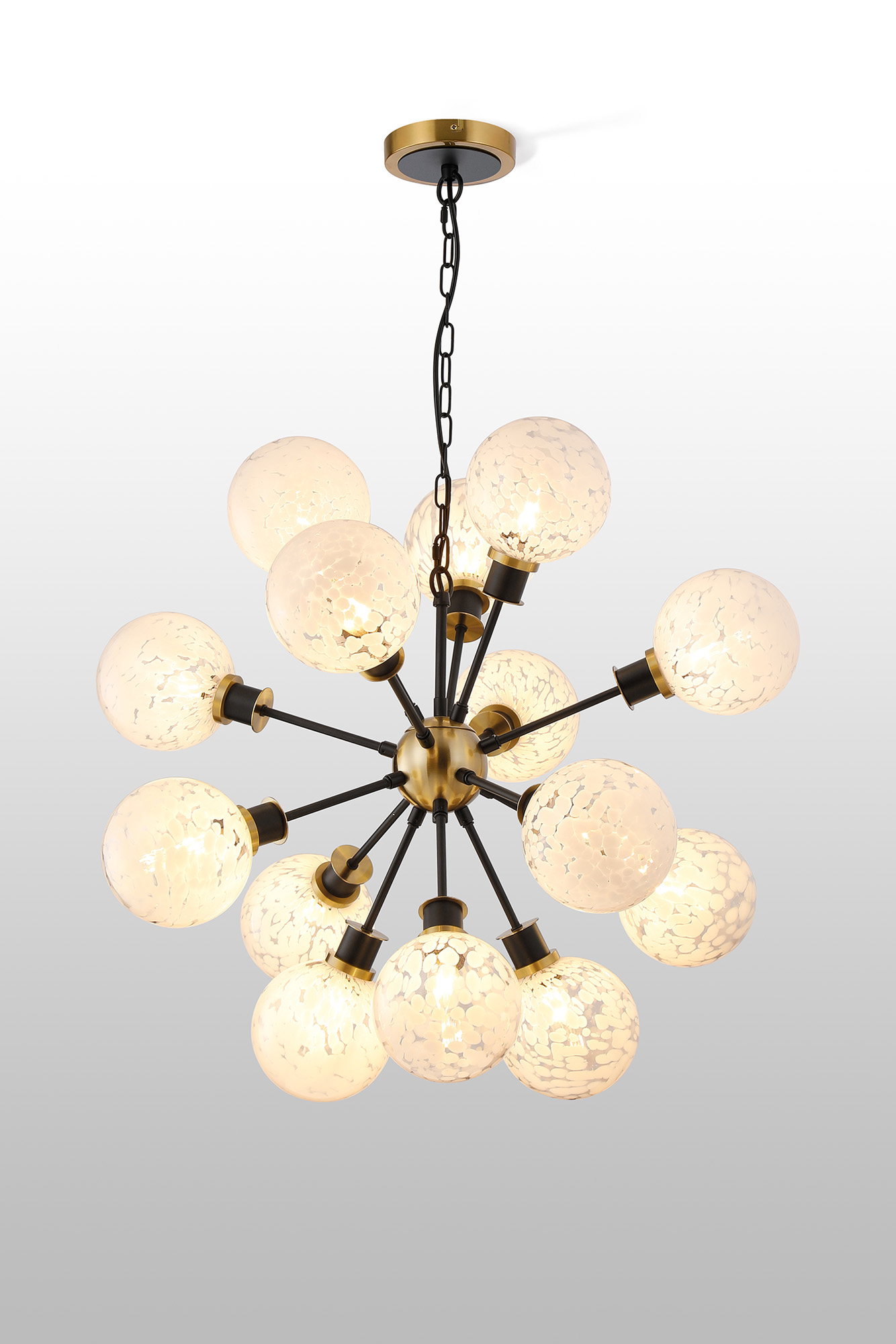 A stunning ceiling pendant, finished in matt black & brass with speckled white glass globes
