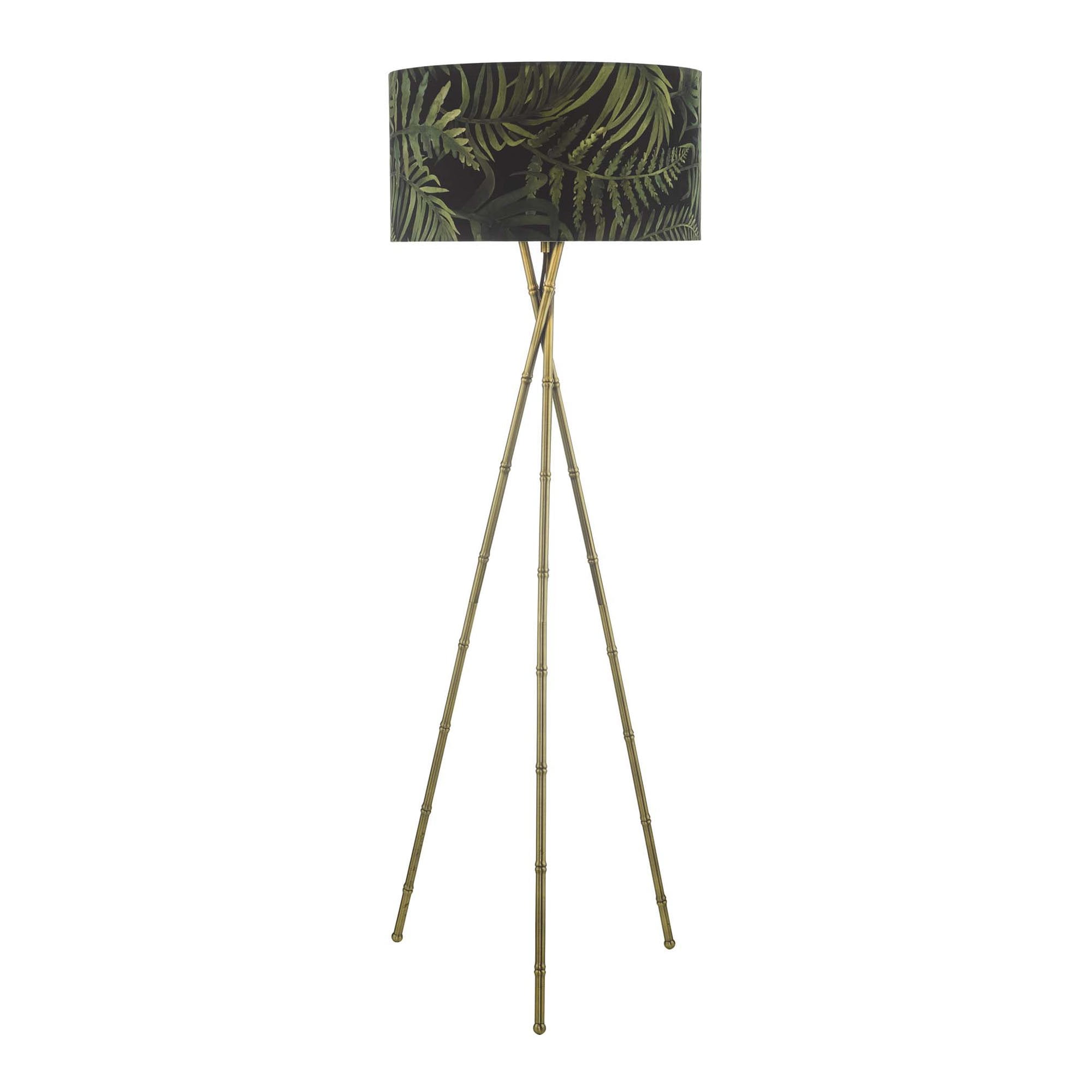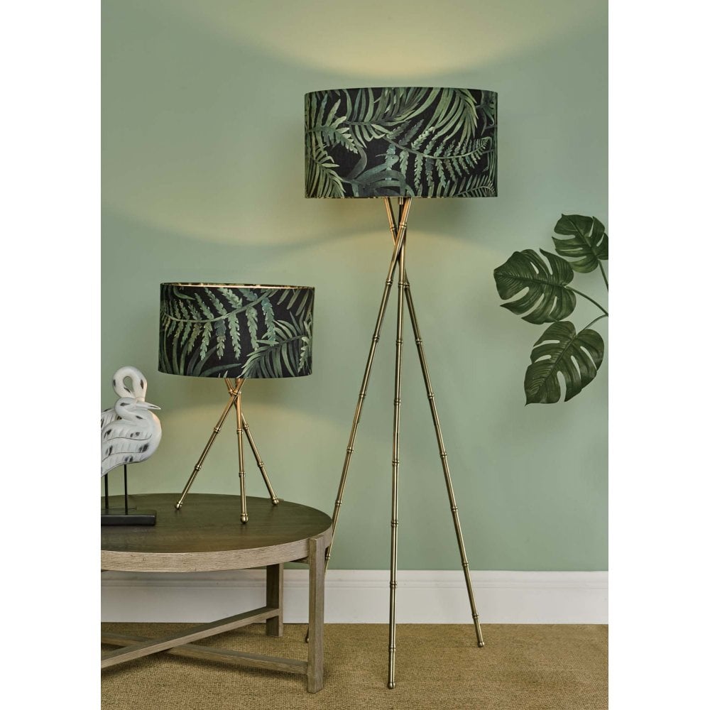 The Bamboo Floor Lamp BAM4975 is a bamboo-style tripod base floor lamp in an antique brass finish that looks fabulous paired with our tropical print shades BAM8655.