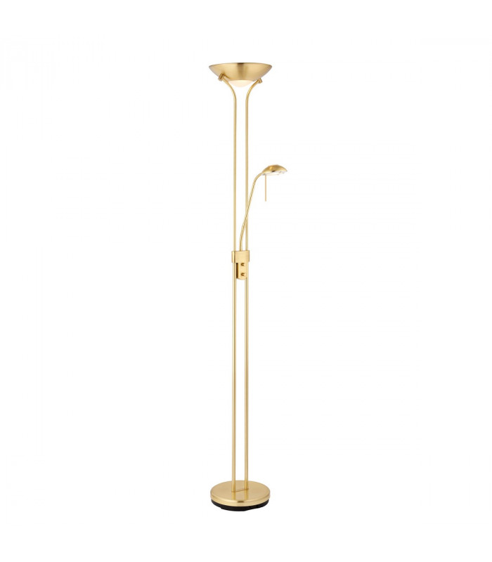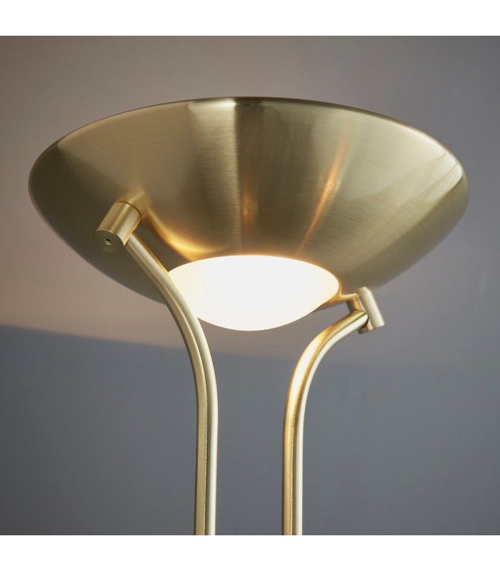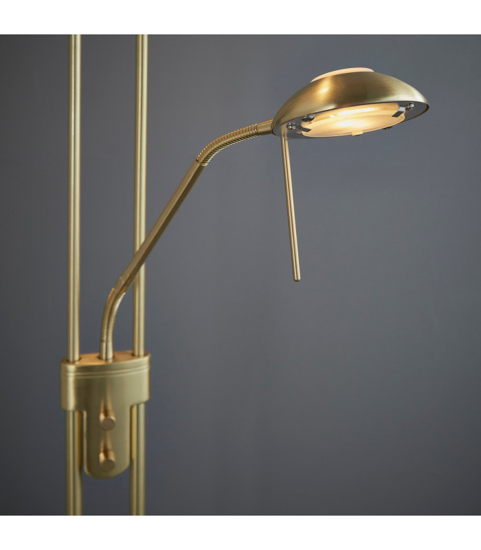 A tall 2 light floor lamp with a double stand supporting an uplighter as well as an adjustable branch holding a reading lamp. Satin Brass plated metalwork with a opal glass diffuser, complete with an easy to reach double rotary dimmer switch.
