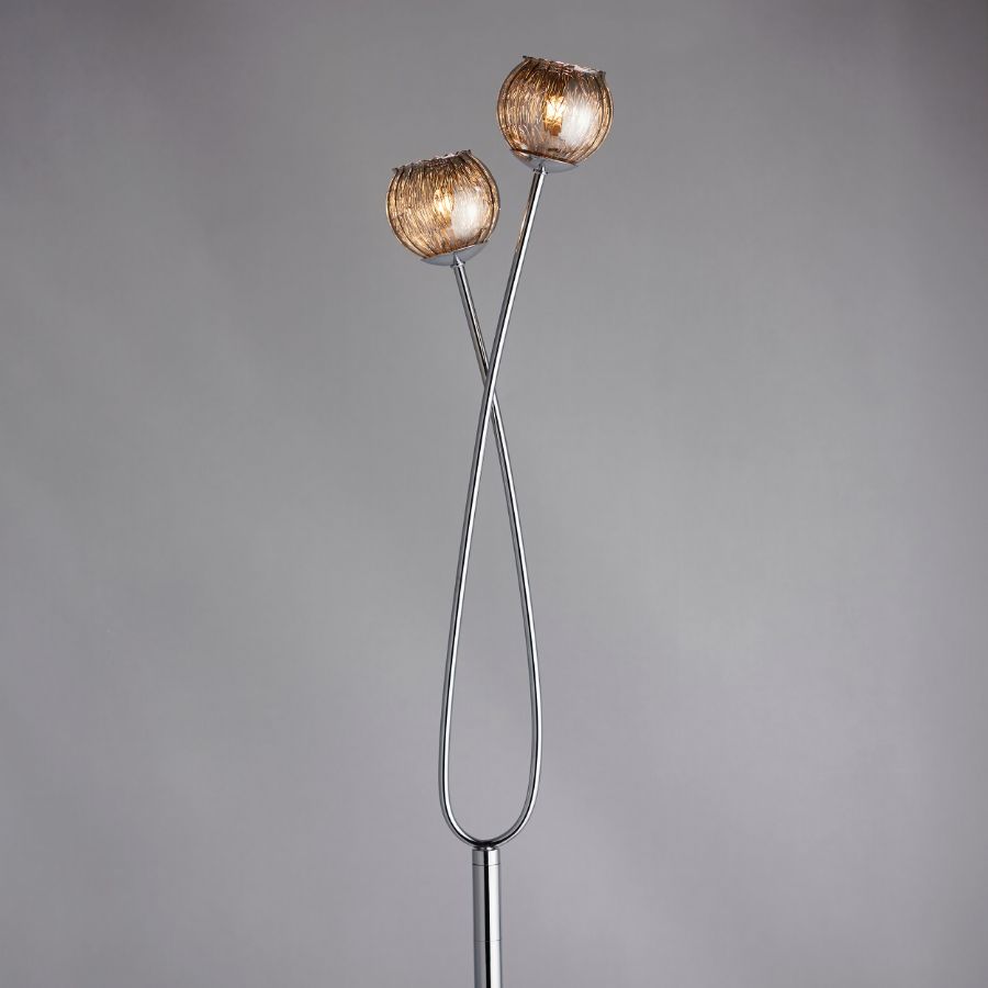 Annie two light floor lamp is finished in a shiny chrome effect plate, with smokey mirror effect glass which houses wire mesh to create a stunning light effect.