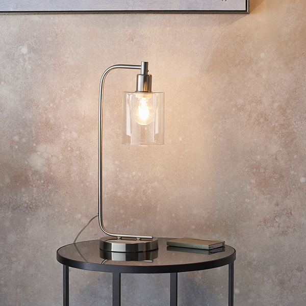 modern Table light for contemporary interiors. Brushed nickel finish with clear glass shade and inline foot switch.