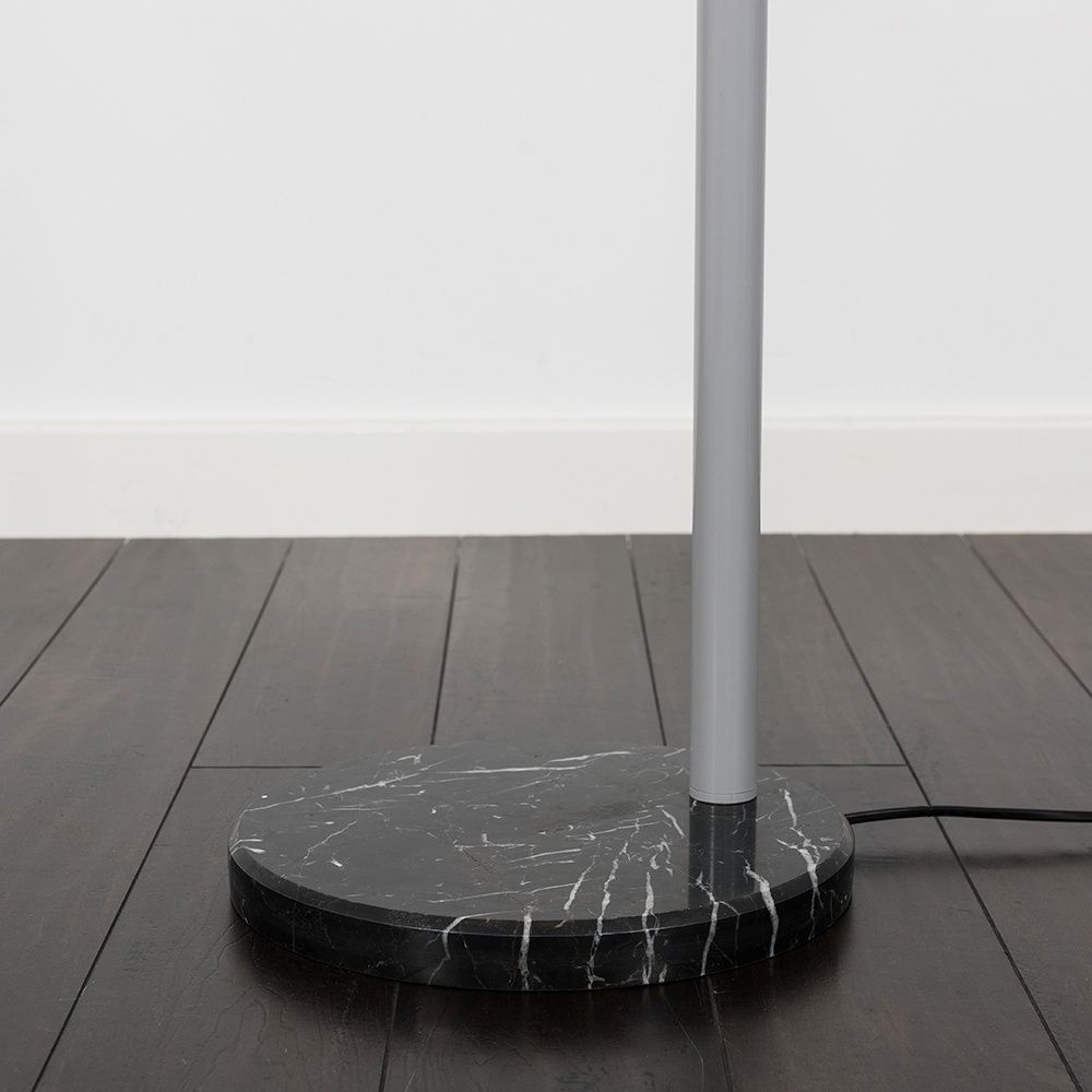 A modern arc floor lamp finished in Matt Grey with metal coloured shades
