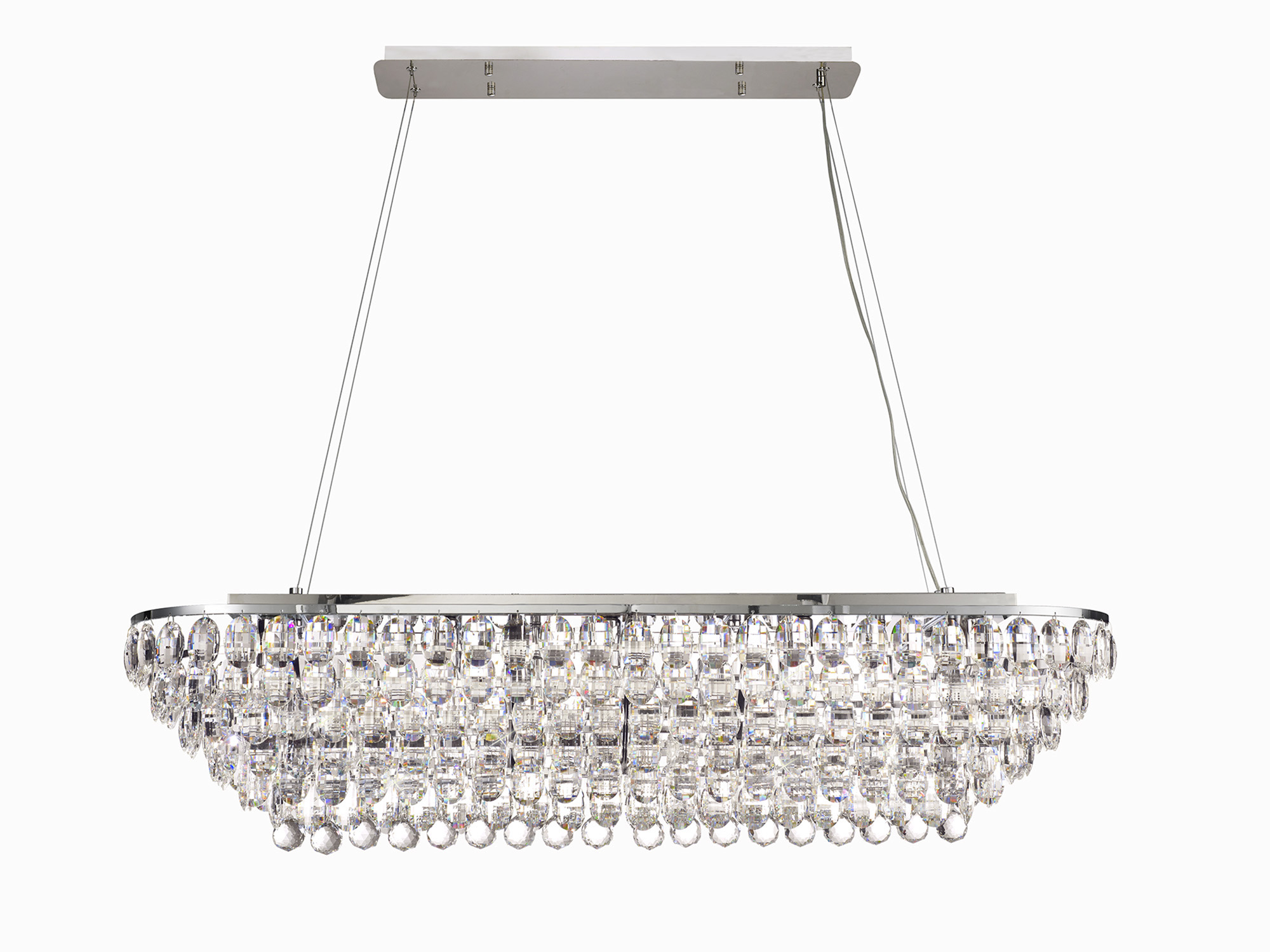 Linear Crystal Bar Pendant, is the Bella is the epitome of a stunning crystal collection. Staying true to the high quality and distinctive designs, this range hosts a substantial abundance of clear crystal pieces. Delicately displayed in a tiered cascading form to outline a striking feature. ideal for dining room or kitchen islands.