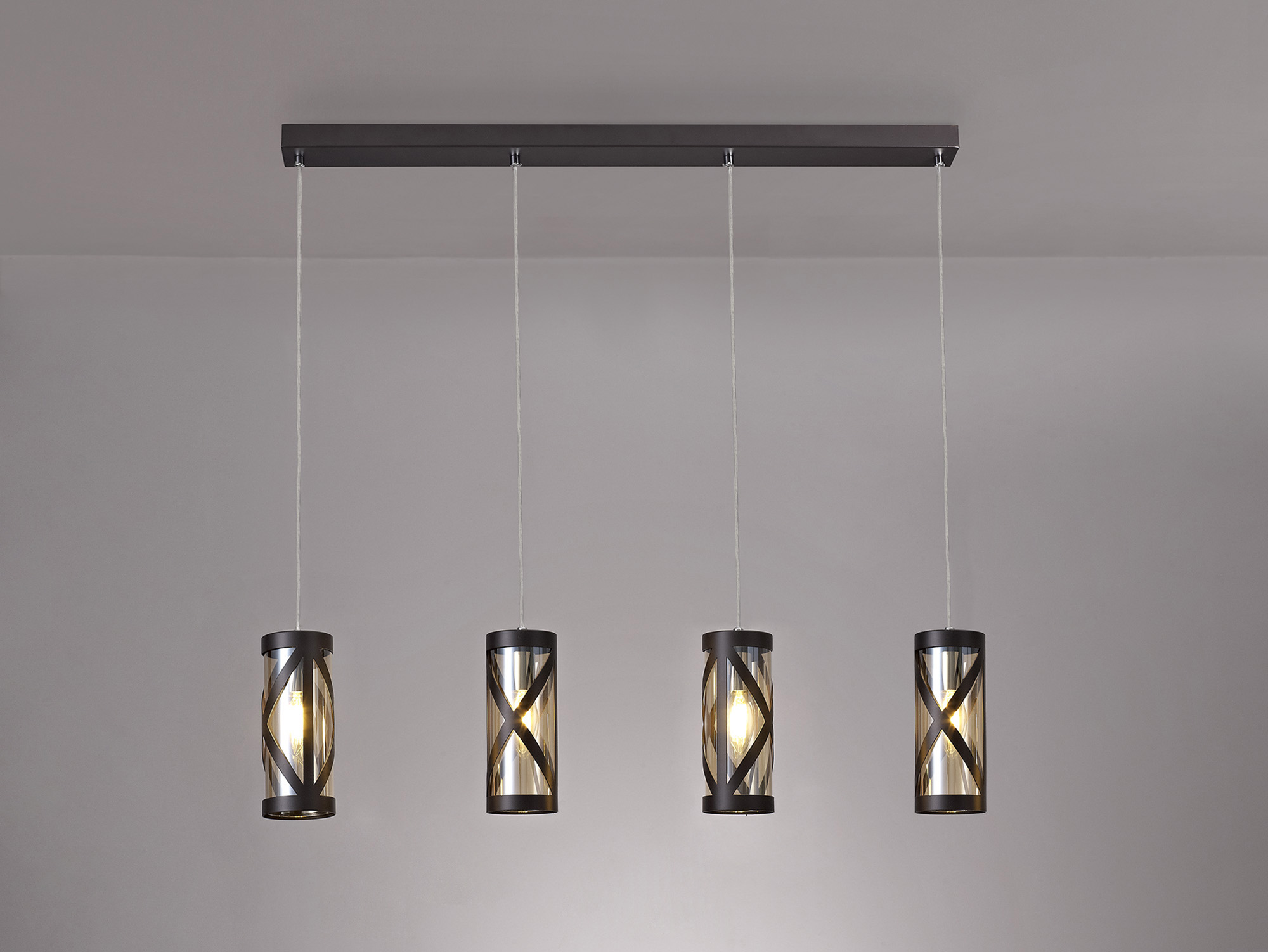 An exquisitely intricate frame crosses over the tinted cylindrical glass which houses E14 lampholders. All seven designs in the Nive range are available in either a matt grey or polished chrome finish with cognac glass or oiled bronze and polished chrome frame with amber glass