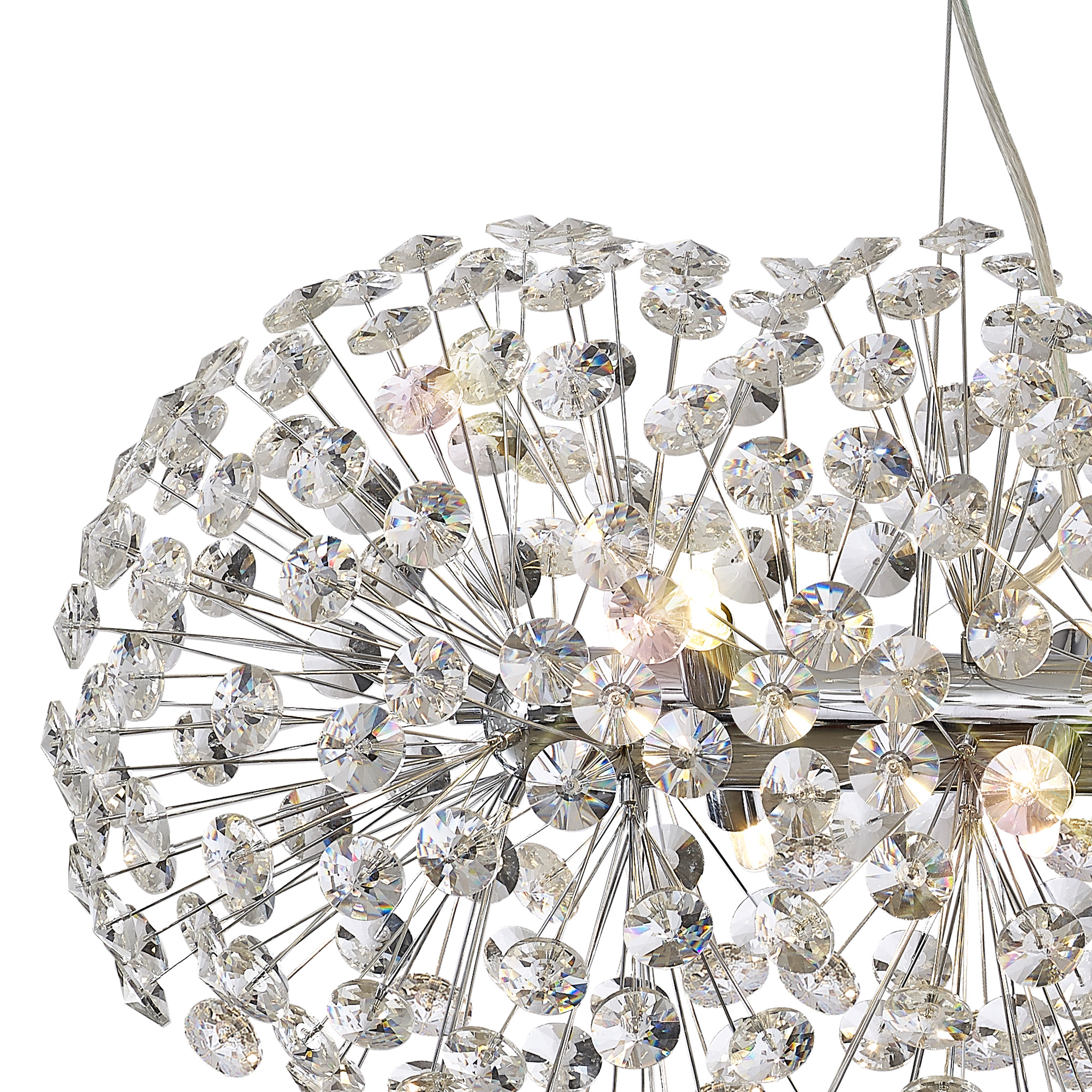 This beautiful comprehensive collection available in either a polished chrome or french gold colour finish, uses slim stems angled erratically to form an enchanting cluster of clear crystal disks. The lines of the central framework of round, tiered and oblong pendants, act as a base from which the crystals can sit around the G9 lampholders ensuring the light emitted from the chosen lamp refracts through each facette throwing sublime spectrums