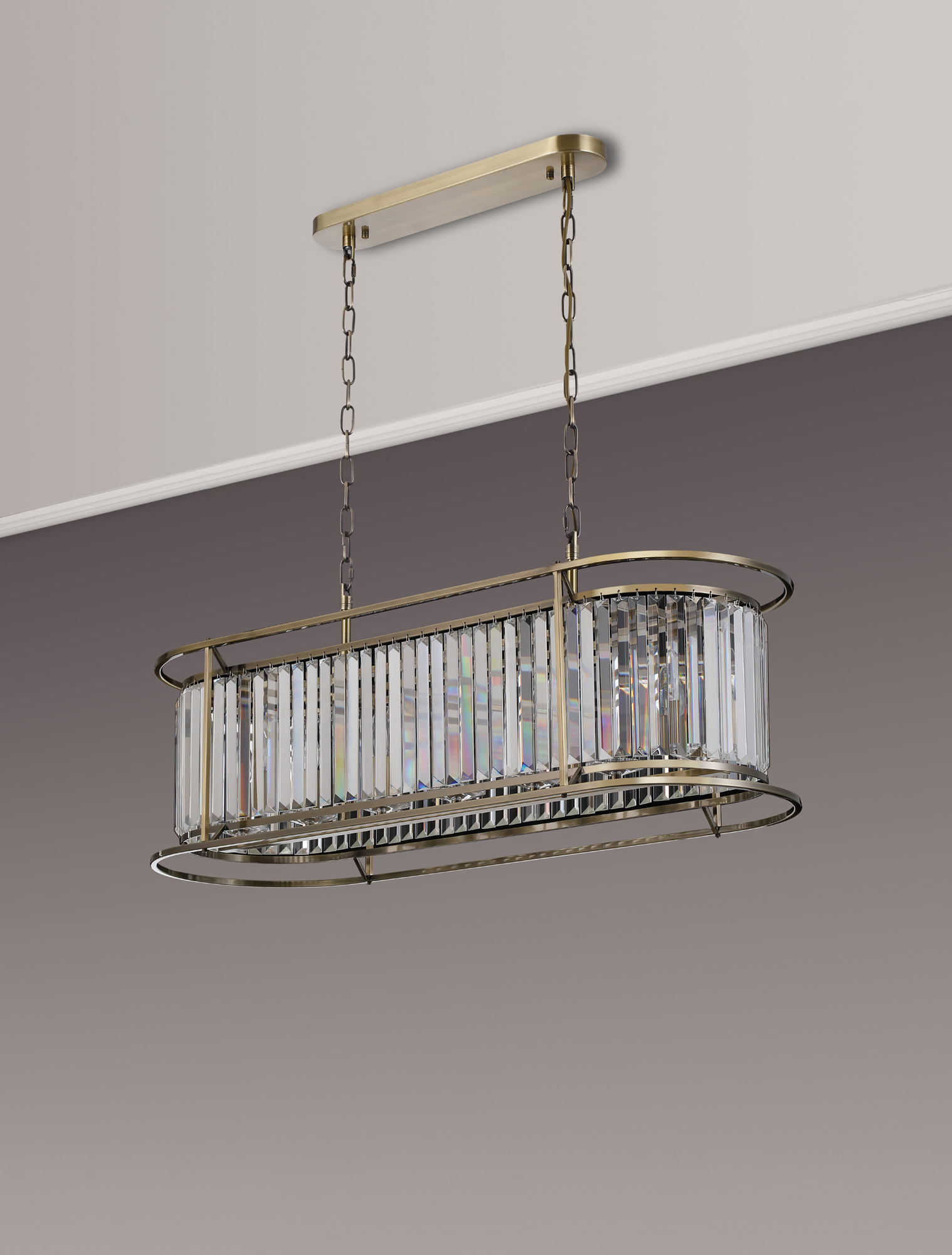 Finished In Antique Brass with crystal decoration, Can be used a semi flush chandelier or pendant. Full range available including round larger & smaller pendants as well as wall light and table lamp.