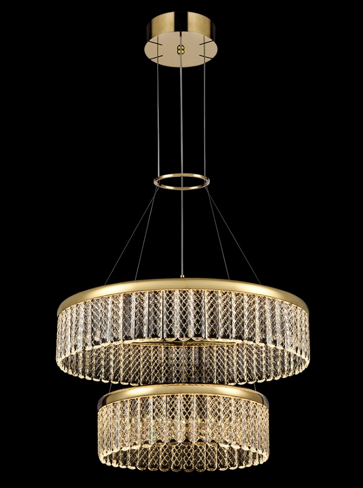 Double tiered LED pendant in a gold finish and delicate lattice detailed crystal glasses with scalloped edge. This pendant is dimmable with a trailing edge dimmer.