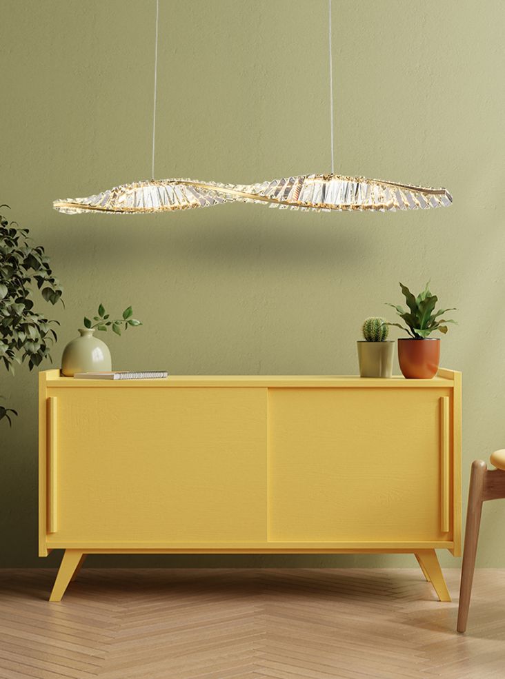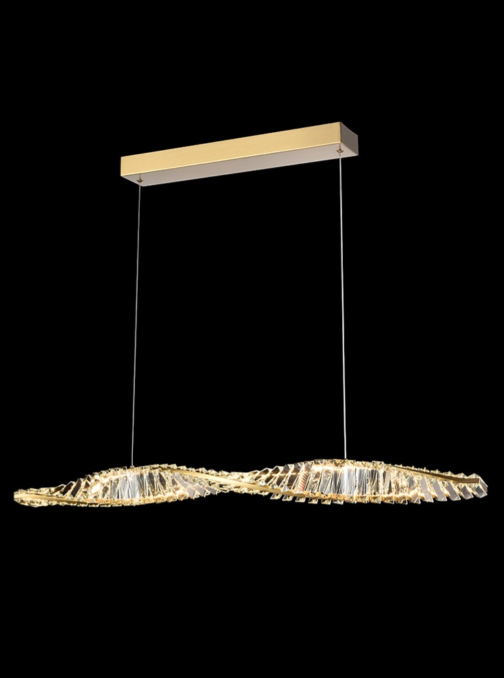 Aged brass finish LED pendant featuring twisted metalwork adorned with rectangular crystals. The pendant is dimmable with a trailing edge dimmer.