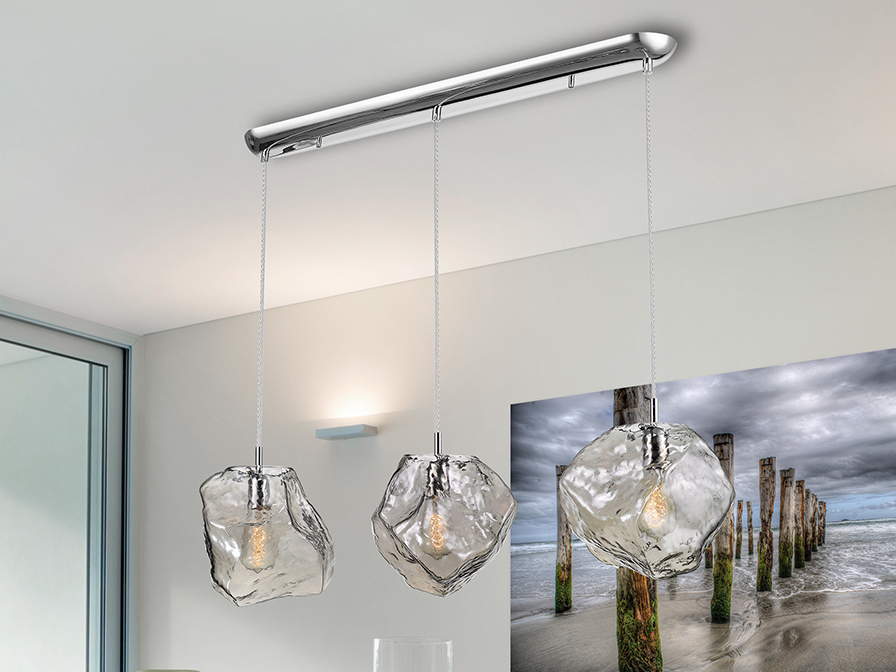 Triple Rock pendant light made of metal in chrome finish. glass shades in light smoke tone. Adjustable in length.