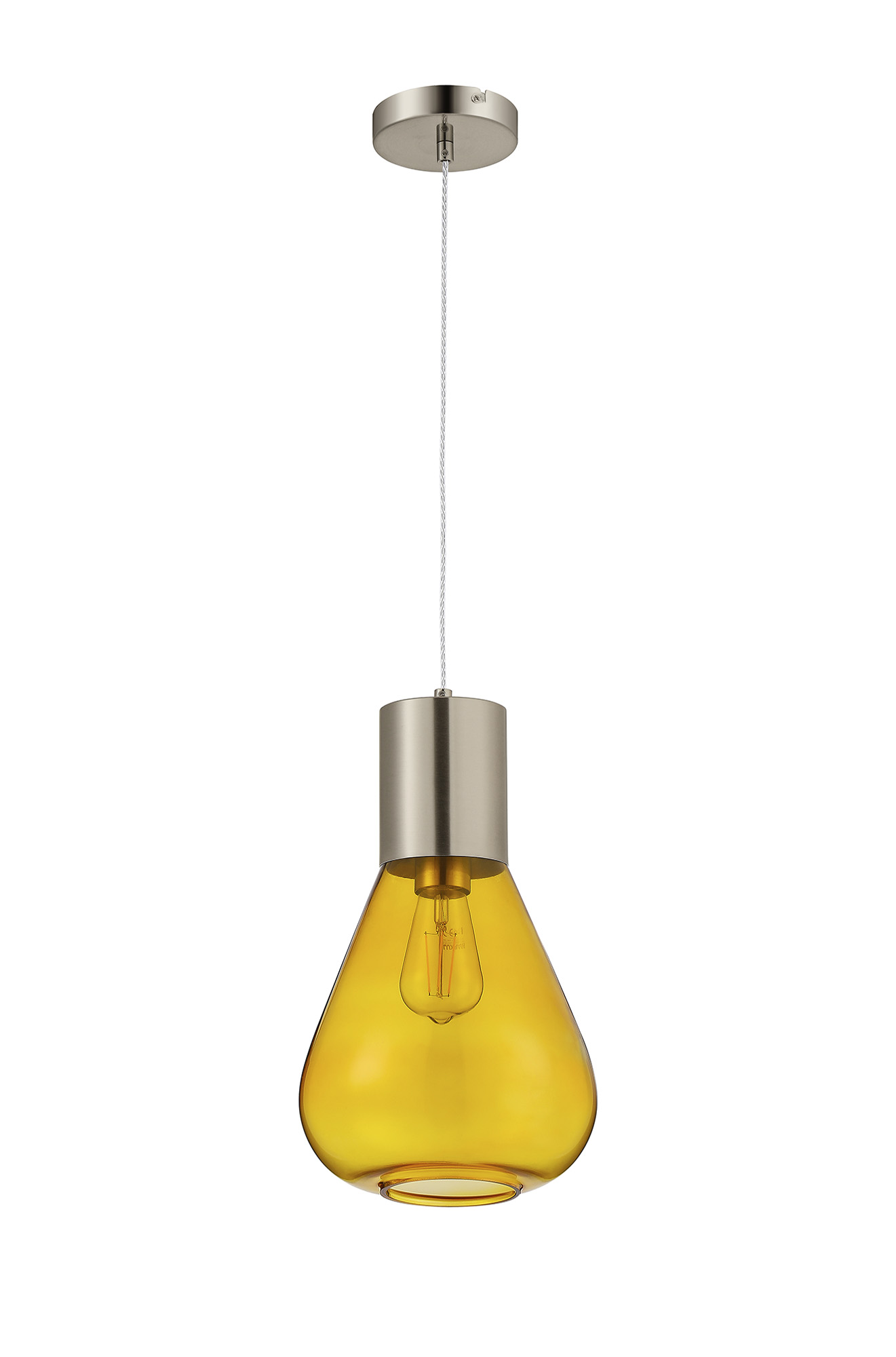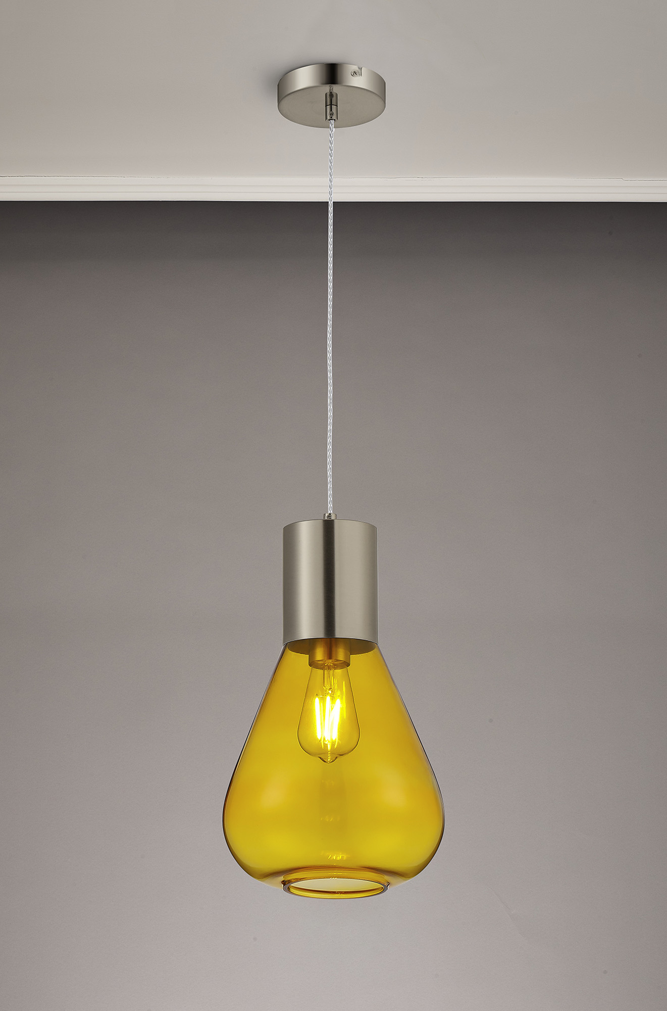 A modern single pendant, finished in satin nickel frame work with Yellow Glass