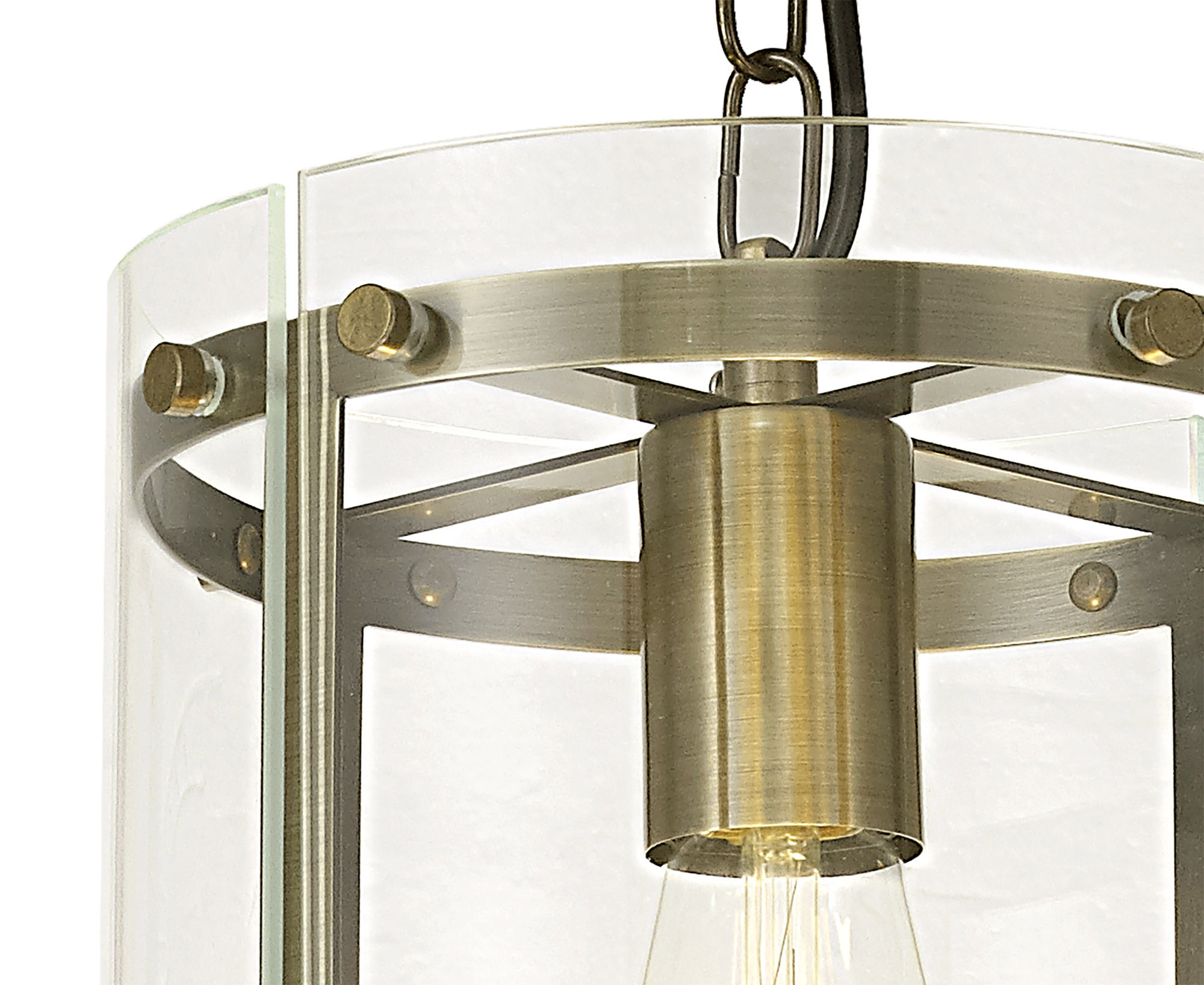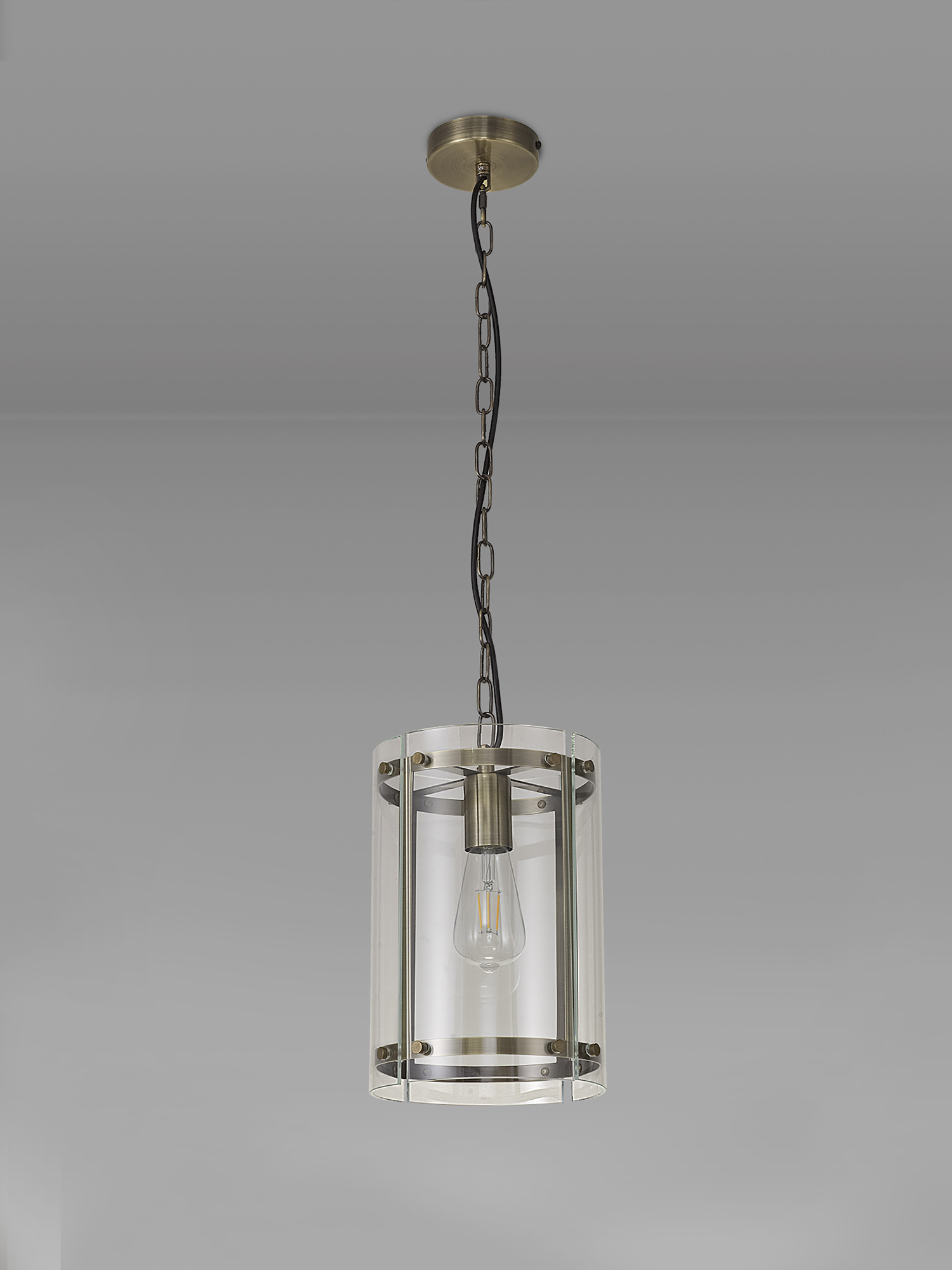 A glass lantern design with a slight twist. finished in antique brass