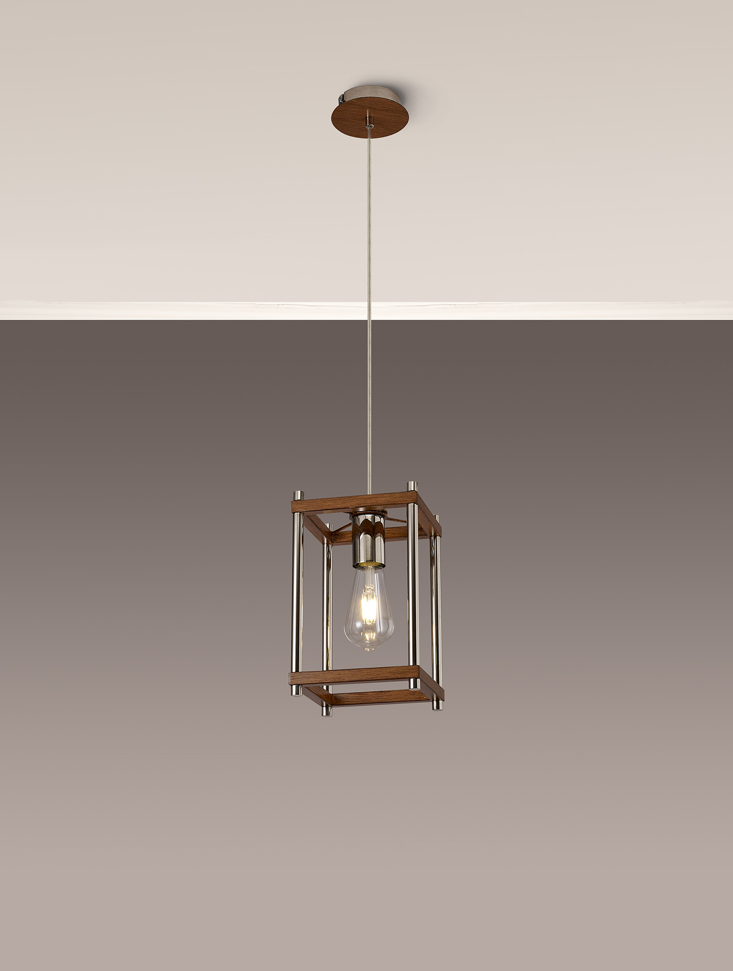 The ana range takes traditional metallic colours finishes and blends them with unique, natural elements. Each pendant within the range is an open face lantern design. The polished nickel is combined with a dark walnut effect while the antique brass is partnered with a lighter medium oak colour. Both of the two finishes are applied to the fixtures in equal measures carried throughout the lights and even extending to the ceiling plates where the wood grain is used in contrast to the metal of the back plate.