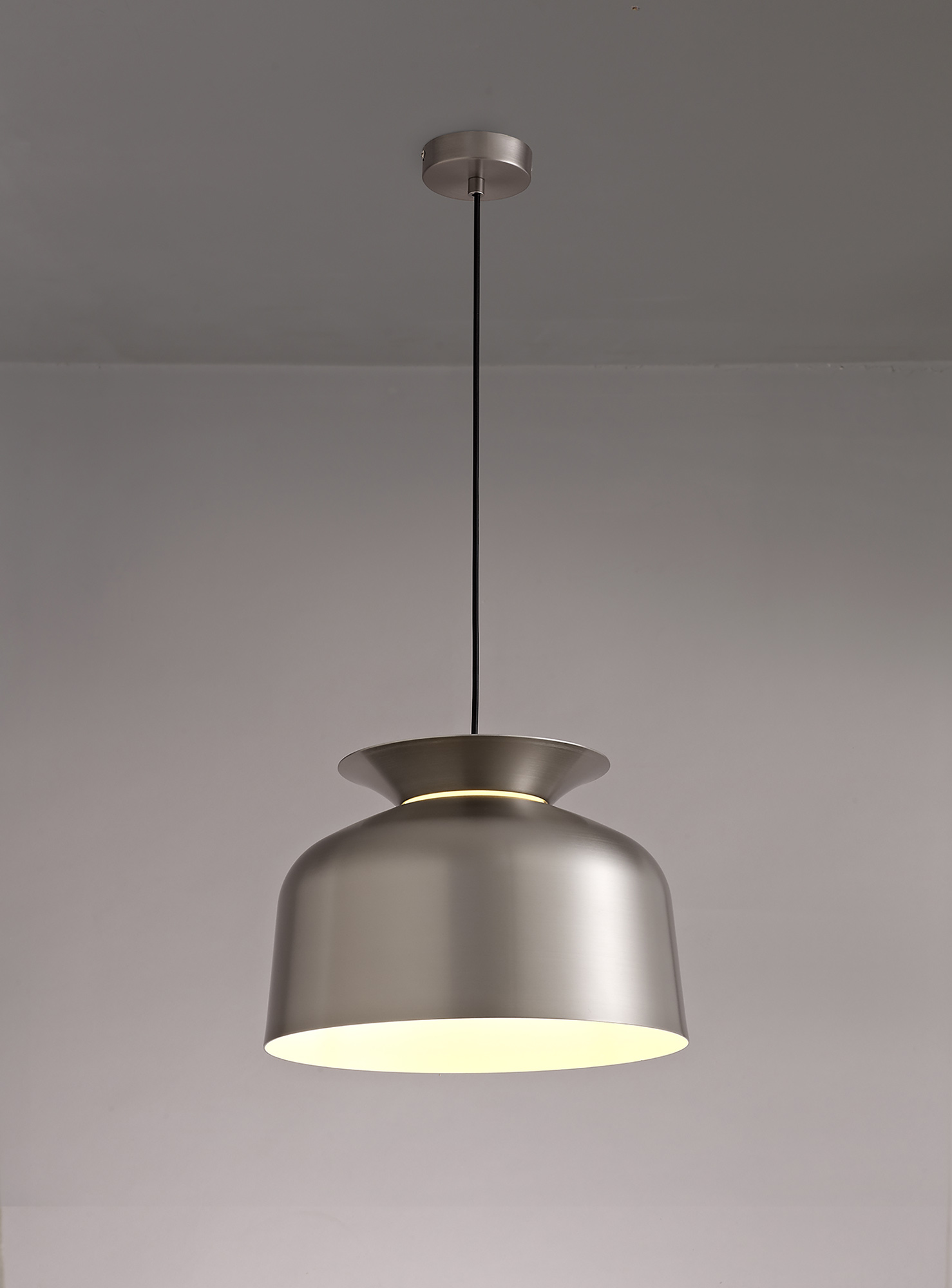Teo is a collection of single pendants, the frames are formed from a larger dome shape and a shallow dish both positioned in different directions to outline the shape of a serving bowl. The slim diffuser where each piece meets has been added to give a soft halo of light in-between both shapes projected,