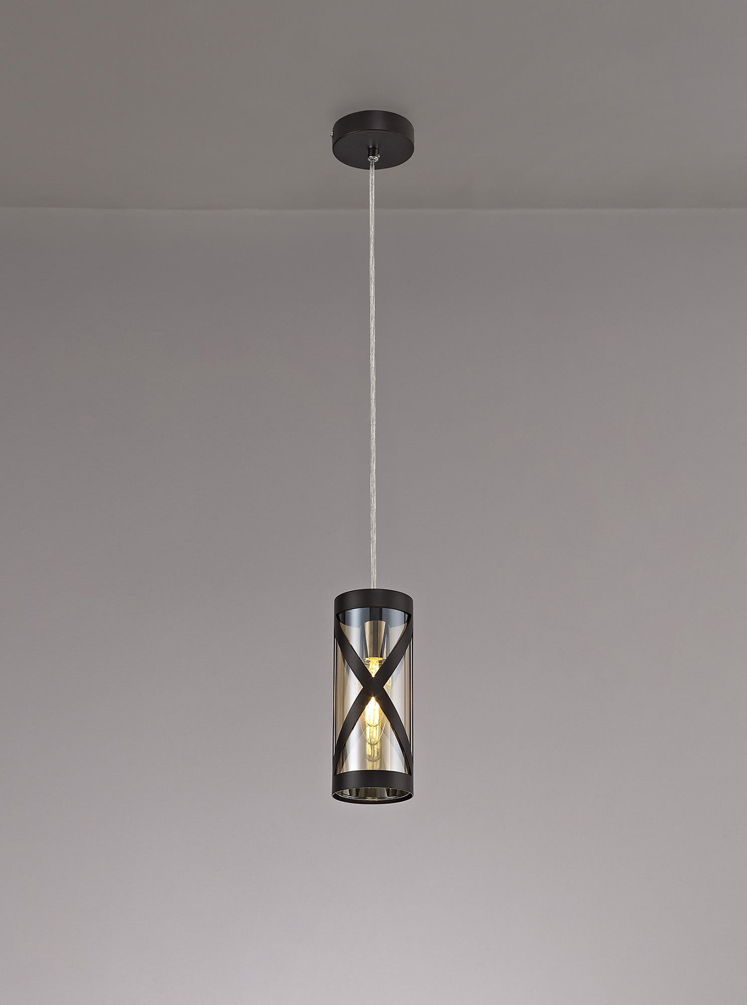 An exquisitely intricate frame crosses over the tinted cylindrical glass which houses E14 lampholders. All seven designs in the Nive range are available in either a matt grey or polished chrome finish with cognac glass or oiled bronze and polished chrome frame with amber glass